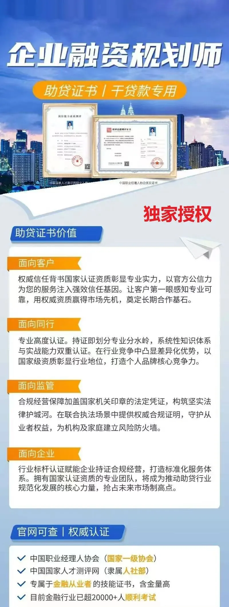 在全国开展“企业融资规划师、公司金融顾问、金融分析师、金融风险管理师、债务规划师”的项目测评,全新助力金融从业者行业更职业、更合规。