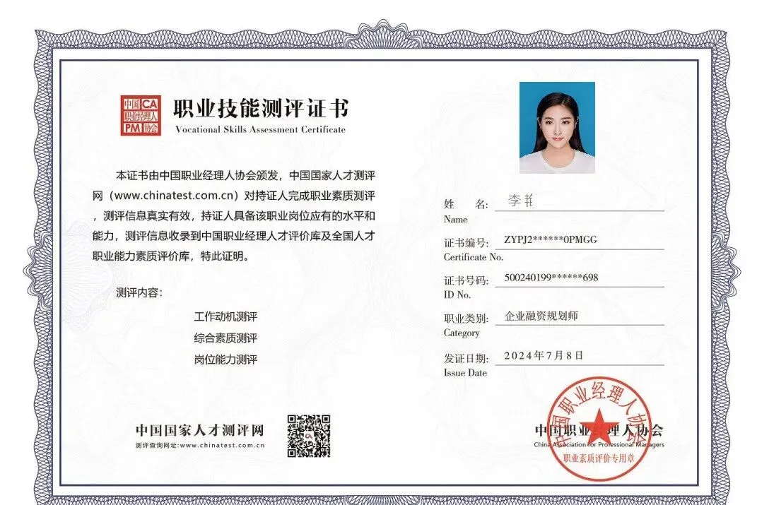 该职业技能测评证书是由中国职业经理人协会(以下简称“中职协”)颁发,中国国家人才测评网(以下简称“国测网”)实施测评并给出测评报告,职业信息收录到中国职业经理人才评价库及全国人才职业能力素质评价库。