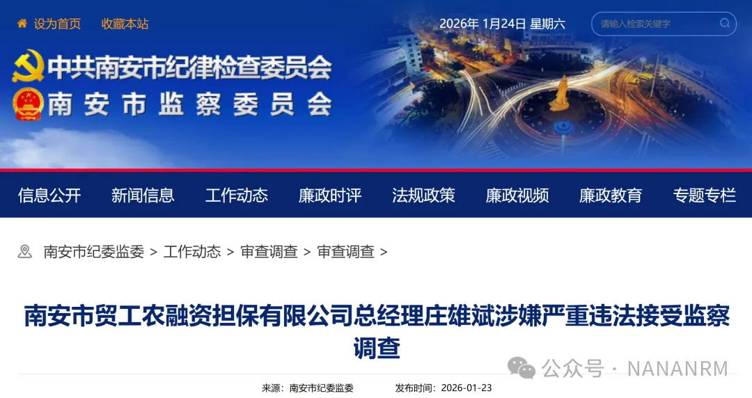 南安市贸工农融资担保有限公司总经理庄雄斌涉嫌严重违法,目前正接受南安市监委监察调查。