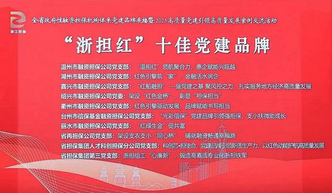 1月22日,全省政府性融资担保体系党建品牌展播暨2025高质量党建引领高质量发展典型案例交流活动在绍兴成功举办。台州信保公司党建品牌“光彩信保”入选全省政府性融资担保机构体系十佳党建品牌。