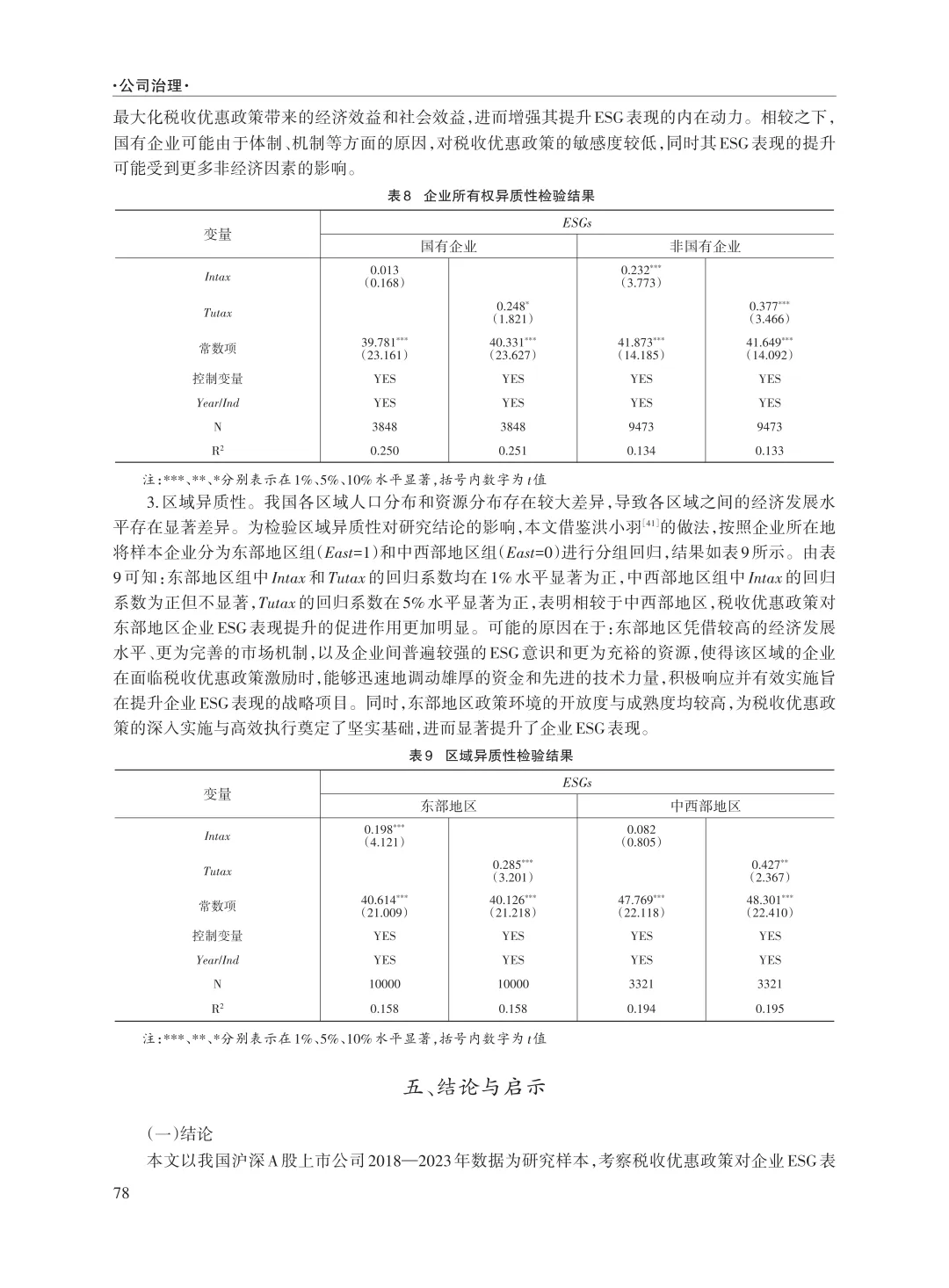 摘 要:税收优惠政策作为财政政策的重要组成部分,可激励企业积极践行 ESG理念,实现经济效益与社会效益的深度融合。文章选取2018—2023年我国沪深A股上市公司数据,实证探究税收优惠政策对企业ESG表现的影响及其作用机制。研究结果表明:税收优惠政策能够显著提升企业ESG表现;从作用机制来看,税收优惠政策主要通过缓解企业融资约束、加大企业研发投入来提升企业ESG表现;进一步分析发现,相较于国有企业,所得税优惠和流转税优惠对非国有企业ESG表现提升的促进作用更明显;相较于中西部地区,两种税收优惠政策对东部地区企业ESG表现提升的促进作用更明显。基于此,今后应持续推进税收优惠政策,强化融资支持与研发激励,推动资本市场整体ESG表现提升,实现经济效益与社会效益协同发展。
