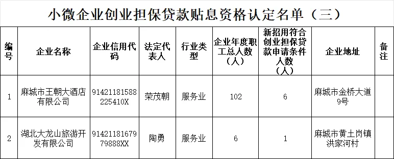 为进一步优化营商环境,持续释放创业带动就业的倍增效应,切实解决小微企业“融资难、融资贵”问题,根据国家统计局关于印发《统计上大中小微型企业划分办法(2017)的通知》(国统字〔2017〕213号)、财政部《普惠金融发展专项资金管理办法》(财金〔2023〕75号)及省财政厅《关于明确创业担保贷款财政贴息有关政策标准的通知》(鄂财金发〔2023〕34号),现对2026年度第三批小微企业创业担保贷款贴息资格认定已审核通过的2家企业名单进行公示。如发现有企业不符合相关政策规定,请向麻城市劳动就业服务中心反映,经认定公示不存在异议的小微企业名单将提交至下一步流程审核。