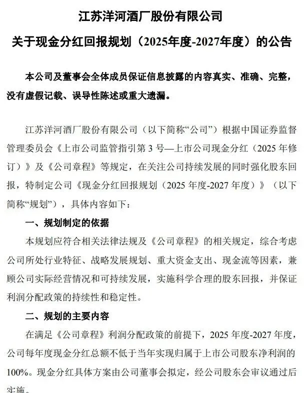 2026年1月24日洋河股份发布2025年业绩预告:归母净利21.16亿-25.24亿,同比暴跌-68%。洋河股份前三季度归母净利是39.75亿,也就是说4季度3个月时间亏损14.5~18.6亿。公司给出的下降原因是这样的:报告期内,白酒行业处于深度调整期,行业竞争格局深刻变革,存量竞争加剧背景下,公司受到市场需求减少、品牌势能减弱、渠道库存加大、渠道利润下降等挑战,中端和次高端价位段产品承压较大,部分市场销售受阻,销量明显下降。相比于业绩下降,让洋河的股东投资者更加不能接受的是,洋河同时发布了《江苏洋河酒厂股份有限公司关于现金分红回报规划(2025年度-2027年度)的公告》。洋河2024年8月30日发布的《江苏洋河酒厂股份有限公司 关于现金分红回报规划(2024年度-2026年度)的公告》中明确写到“2024年度-2026年度, 公司每年度的现金分红总额不低于当年实现归属于上市公司股东净利润 的70%且不低于人民币70亿元(含税)。”本次公告将原定2024~2026年每年保底分行70亿给取消掉了,这一下让洋河的小股东炸了锅。如果当时很多人按照最低70亿计算的话,按照目前的洋河股份的股价当下计算的股息率约7.4%,当时很多人就是冲着高股息才买的洋河。两者对比,原来虽然比例只有70%,但是当时(2024年8月)对未来市场回暖还是信心满满,预计未来年净利润至少70亿元以上。这一次的公告,虽然把分红比例从70%提高到了100%,但是锅里都没有了,分的比例再大,碗里也就这回事了。按照归母净利润的100%计算,没有最低值了,也就是说2025的分红从70亿变成了约23亿,这是打了骨折,股息率从7.4%变成2.4%了。短短一年,现实是如此残酷。白酒行业的洗牌力度,可能会比我们想象的大。洋河这份业绩是白酒行业才刚刚开始!所以白酒行业周期底部区域的寒冬还刚刚开始,可以预见的是,白酒行业的业绩雷还远未炸完,后续仍有更多企业将面临业绩承压的考验。2026年白酒行业的业绩表现可能是大概率会进一步承压,迎来更艰难的调整期;而这场持续的行业洗牌,也将推动行业去库存、挤泡沫走向深入,待到行业出清完成。