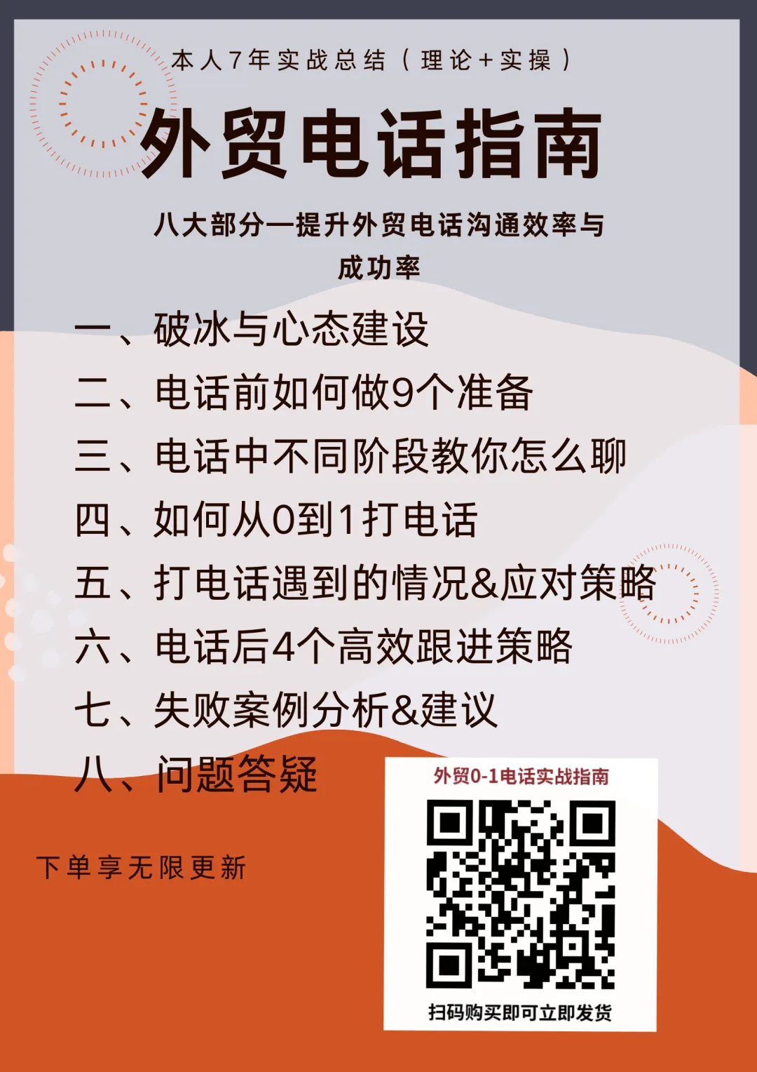 我结合7年5万个电话实战写成《外贸电话指南》59.9,保姆级指导从0-1上手电话开发,内容如下。