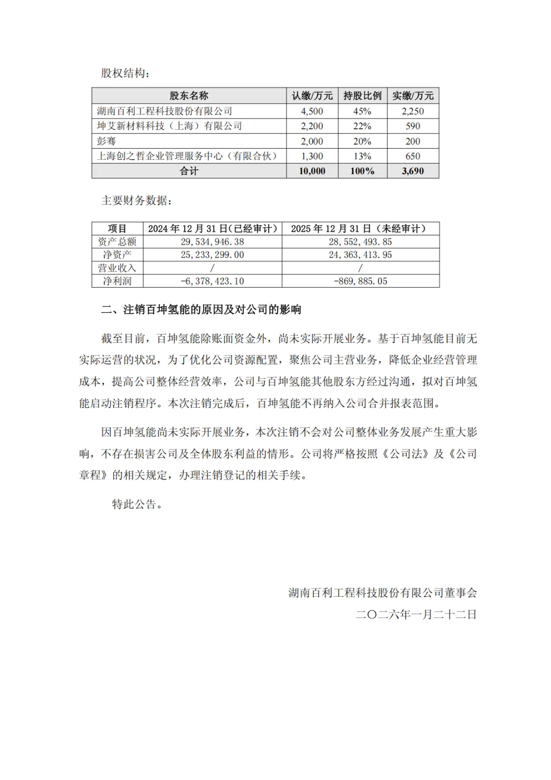 氢能汇获悉,近日,湖南百利工程科技股份有限公司(简称:百利科技)发布关于注销控股子公司的公告。