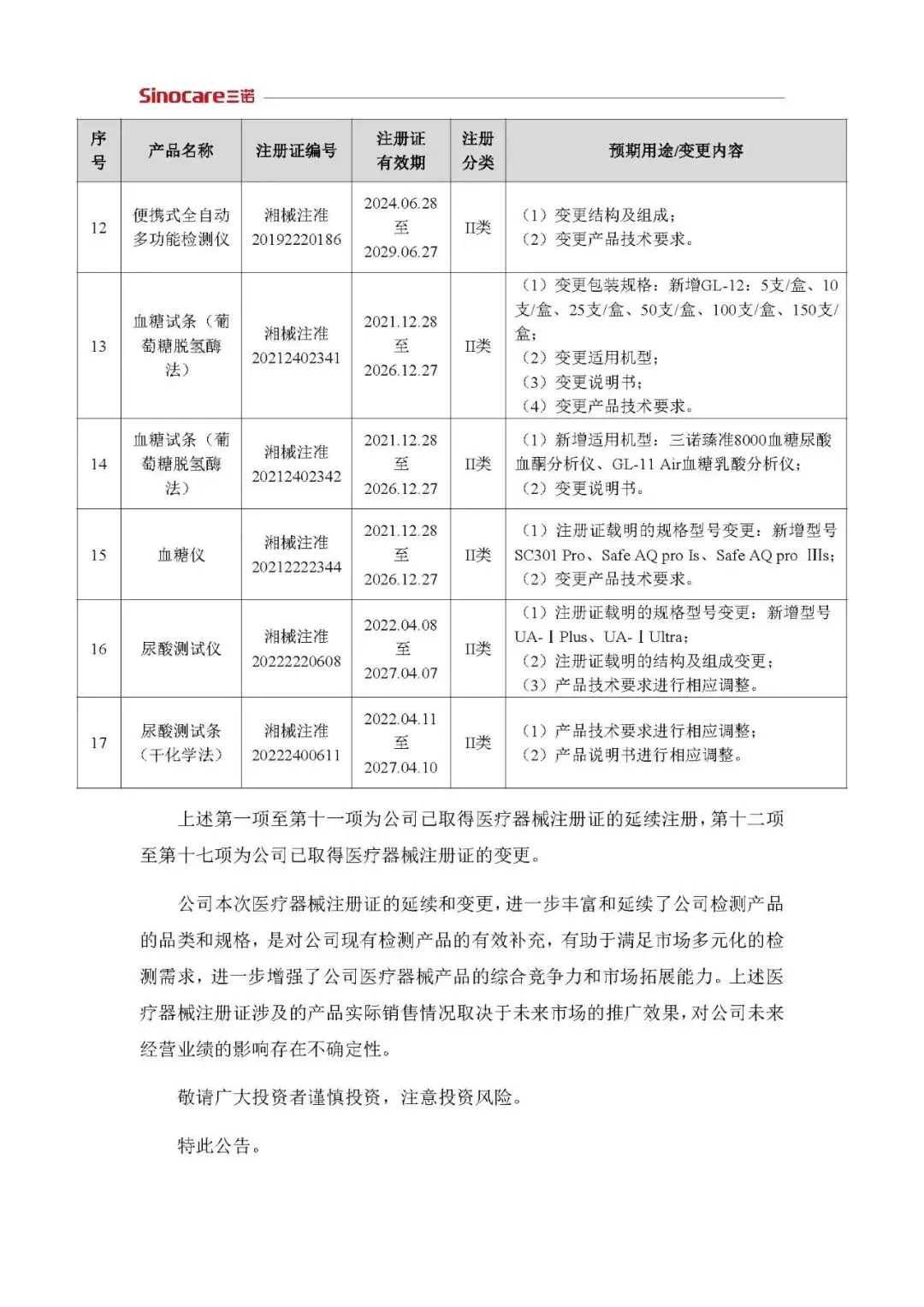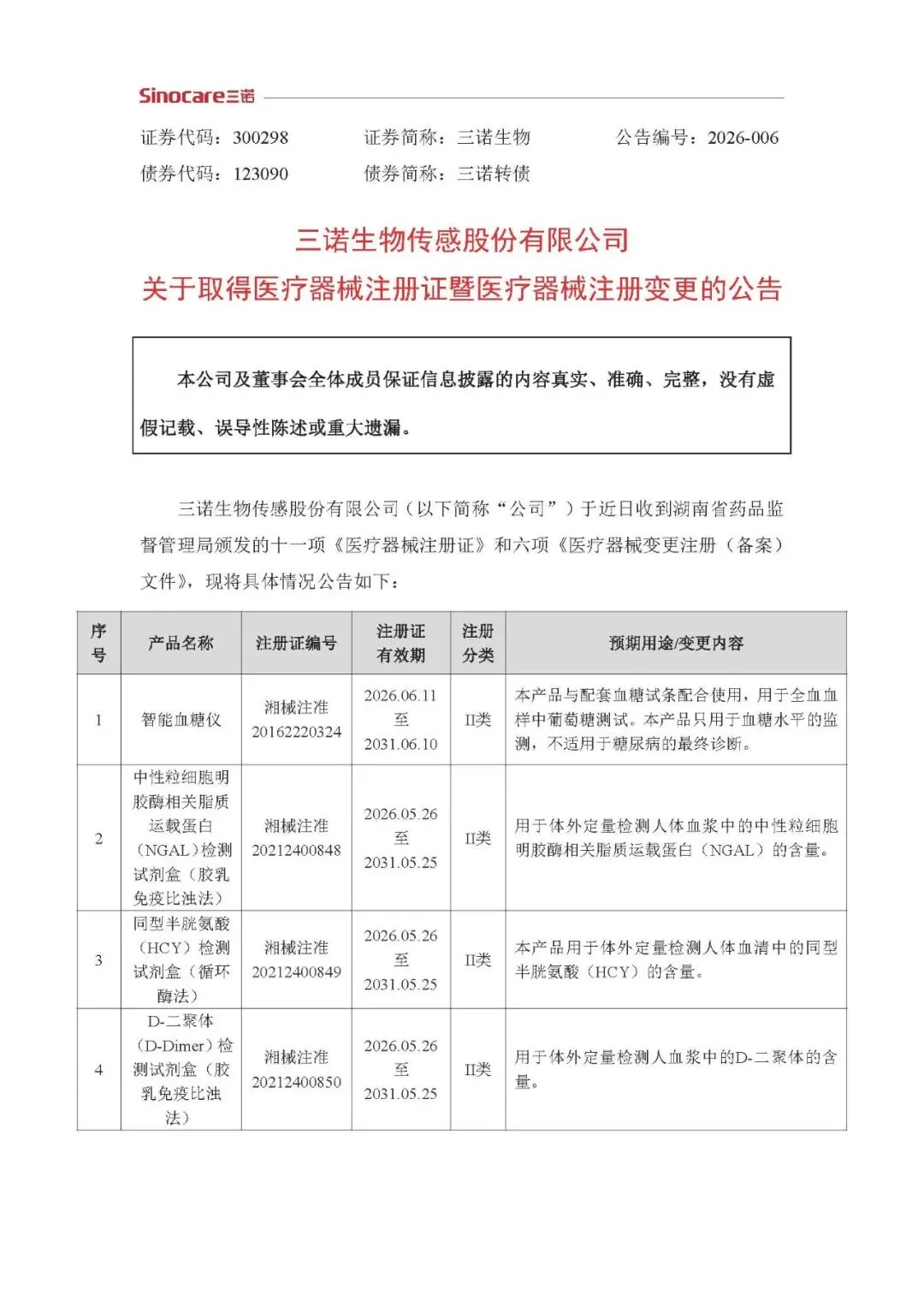 1月23日公告。三诺生物传感股份有限公司(于近日收到湖南省药品监督管理局颁发的十一项《医疗器械注册证》和六项《医疗器械变更注册(备案)文件》。