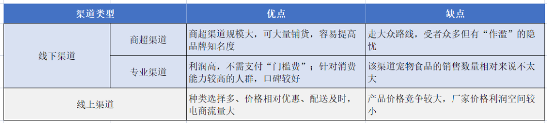 从销售渠道来看,全球宠物食品行业主要以商超渠道、专业渠道、线上渠道和宠物诊所为主。不同国家宠物食品发展历程不同,销售渠道结构也有明显差异。受益于成熟的电商行业发展,中国宠物食品行业的最主要销售渠道为线上渠道,2021年占比高达60.9%;日本宠物食品销售渠道则以专业市场为主,2021年占比为50.6%,其中又以家居和园艺专业零售商占比最高;美国则有着成熟的线下商超渠道,包括沃尔玛等龙头零售商,2021年美国宠物食品行业商超渠道占比为45%。宠物食品行业下游市场以营销渠道为主,在中国宠物食品销售渠道主要有两类:线下渠道和线上渠道,其中线下渠道包括商超渠道和专业渠道,后者又包括宠物食品专营店和宠物医院等。目前线上销售已经成为宠物食品行业的主要销售渠道。表3 中国宠物食品行业各销售渠道优缺点对比