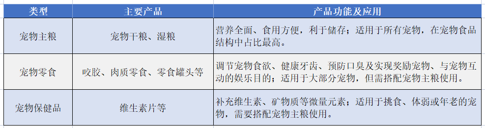 宠物食品是专门为宠物提供的食品,介于人类食品与传统畜禽饲料之间,其作用主要是为各种宠物提供最基础的生命保证、生长发育和健康所需的营养物质,具有营养全面、消化吸收率高、配方科学、饲喂方便以及可预防某些疾病等优点。宠物食品按照产品类型可以分为三类,不同类型宠物食品具有其特有功能。宠物主粮营养全面、食用方便,利于储存,适用于所有宠物;宠物零食通常用于调节宠物食欲、健康牙齿、预防口臭或者与宠物互动,适用于大部分宠物;宠物保健品则用于为挑食、体弱或年老的宠物补充维生素、矿物质等微量元素。总体而言,宠物主粮在宠物食品中占比最高,宠物零食和宠物保健品均需搭配宠物主粮使用。