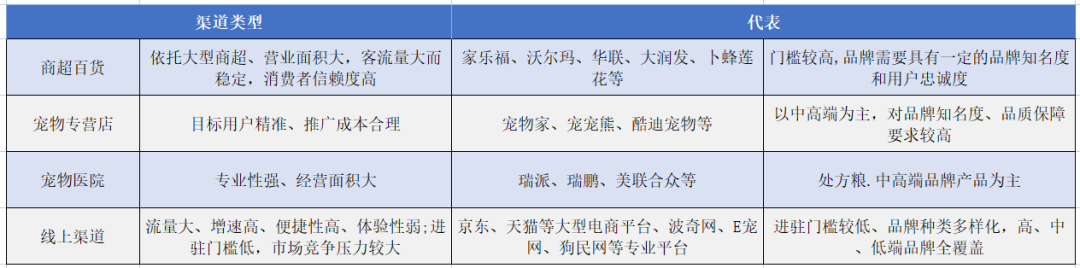 总体来看,目前我国宠物食品销售渠道主要包括商超百货、宠物专营店、宠物医院和线上渠道。商超百货渠道指依托于大型商超的宠食货架、专柜等,如沃尔玛、家乐福,具备营业面积大、客流量大而稳定、以面向大众消费为主等特点。宠物专营店通常采用多品牌代理销售模式,代理品牌以中高端为主,目标客户精准;以宠物家、宠宠熊、酷迪宠物等为区域性代表,目前仍未产生具有全国影响力的专营店品牌。宠物医院渠道是挂靠在专业宠物医院下的销售平台,从业人员专业性强,科学性高,销售品种以处方粮、中高端产品为主。线上渠道包括天猫等大型电商平台,同时辅以波奇、E宠等专业宠物用品销售平台,线上平台产品种类多元、支付和运送便捷、用户粘性较高。