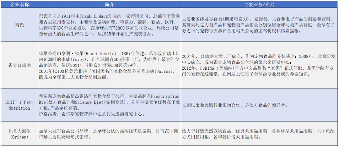 根据Euromonitor公布的数据,2021年,全球前六大宠物食品企业均来自美国,其中玛氏和雀巢普瑞纳的市场份额遥遥领先,为全球宠物食品龙头企业。2021年全球宠物食品行业CR5为52.4%,排名前三位的宠物食品生产企业分别为玛氏、雀巢、高露洁,全球市场份额分别为21.1%、19.8%和4.9%。1、宠物主食竞争格局:国外品牌排名靠前