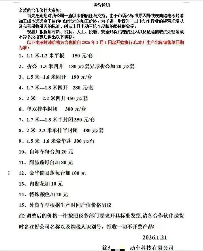 ⭕2、【丰县烤漆企业涨价】近日,丰县多家烤漆厂家发布通知,因原材料、能耗、人工、税收、安全环保治理等成本变化,对全系车型烤漆价格上调,上调幅度10至100元不等,并规定执行节点,过后订单一律按新价结算。