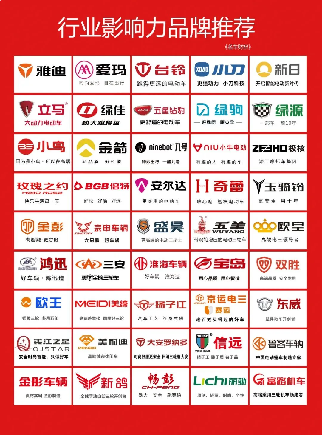 ⭕1、【年度盘点:行业十大影响力女性】雅迪副董事长钱静红,爱玛副董事长段华,绿源总裁胡继红,新日副董事长陈玉英,小刀副总经理武金萍,小鸟副总经理张红,步步先董事长张梅,金彭休三总经理李梦琪,五星钻豹副总裁黄玲素,立马财务负责人罗雪琴。