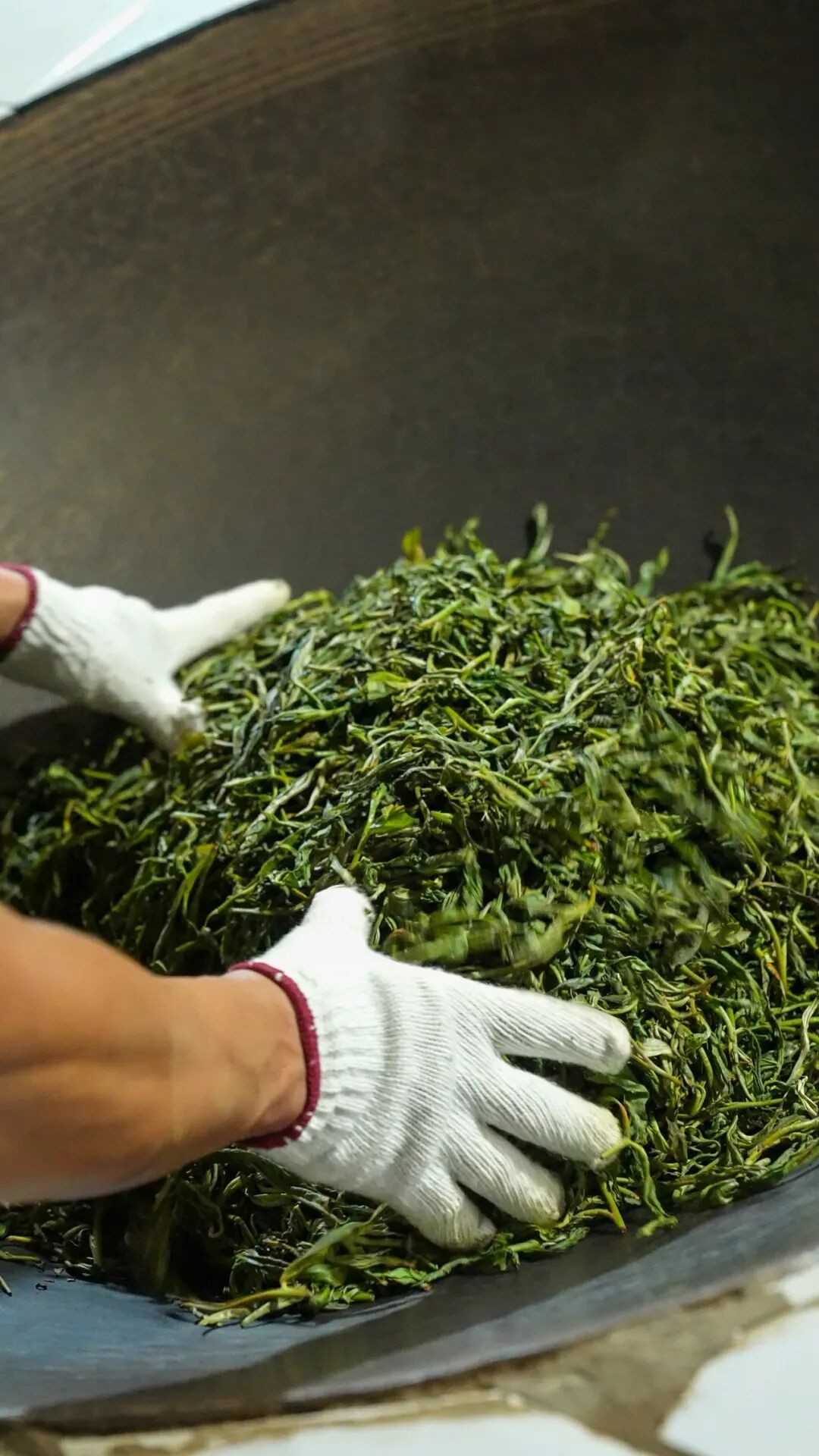 杀青后的茶叶,趁热揉捻,让茶叶卷成条索状。