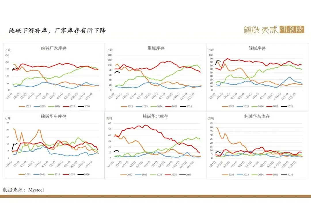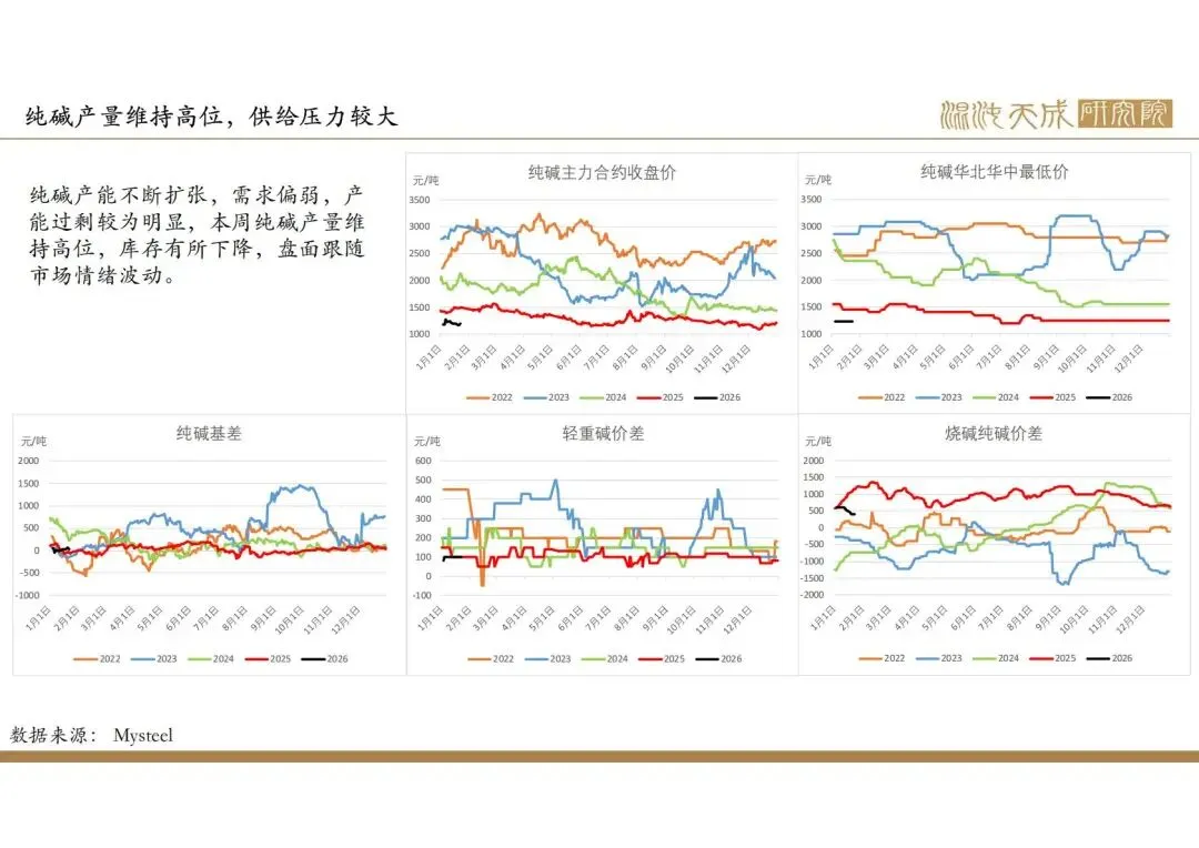 浮法玻璃弱势下跌至成本附近,产量持续下降。光伏玻璃库存回升至较高位,日熔量中位维持。烧碱价格高于纯碱,纯碱对烧碱需求有一定替代,但整体需求仍一般,没有实质性变化,当前计算纯碱周度供需平衡产量在72万吨左右。