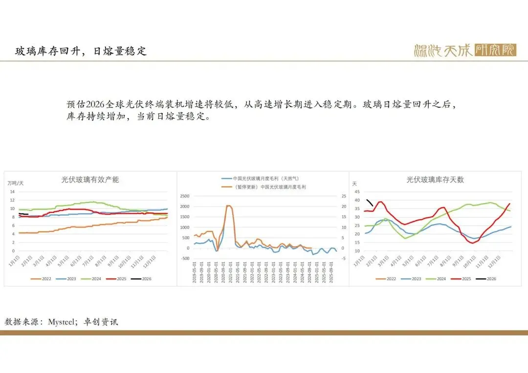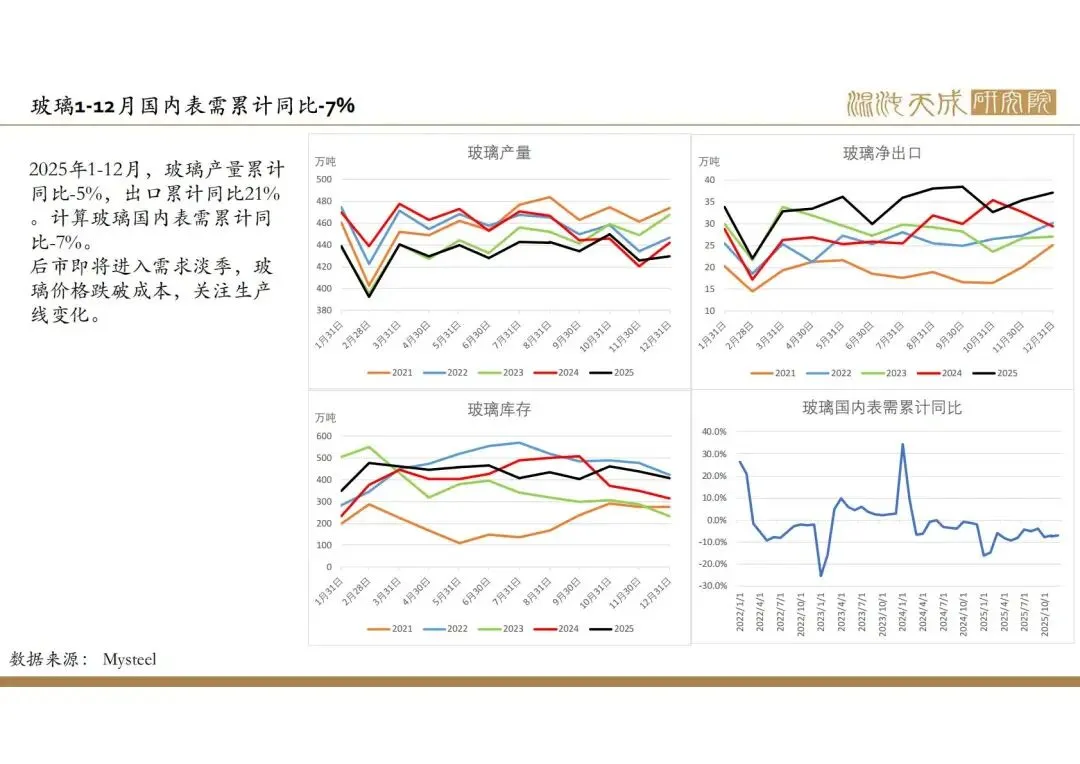 中长期矛盾:根据房地产建设周期计算,当前房地产竣工仍处于下行周期,新房玻璃需求仍在持续下滑,而二手房成交较好,汽车、家电、电子产品产量仍在增加,对玻璃需求有一定支撑,综合计算预期2026年玻璃需求仍将大幅下降,需要更多减产才能达到供需平衡。