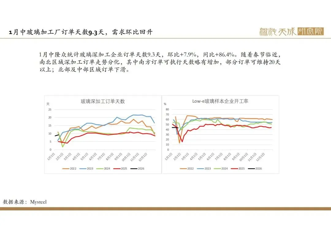 1月中隆众统计玻璃深加工企业订单天数9.3天,环比+7.9%,同比+86.4%。随着春节临近,南北区域深加工订单走势分化,其中南方订单可执行天数略有增加,部分订单可维持20天以上;北部及中部区域订单下滑。