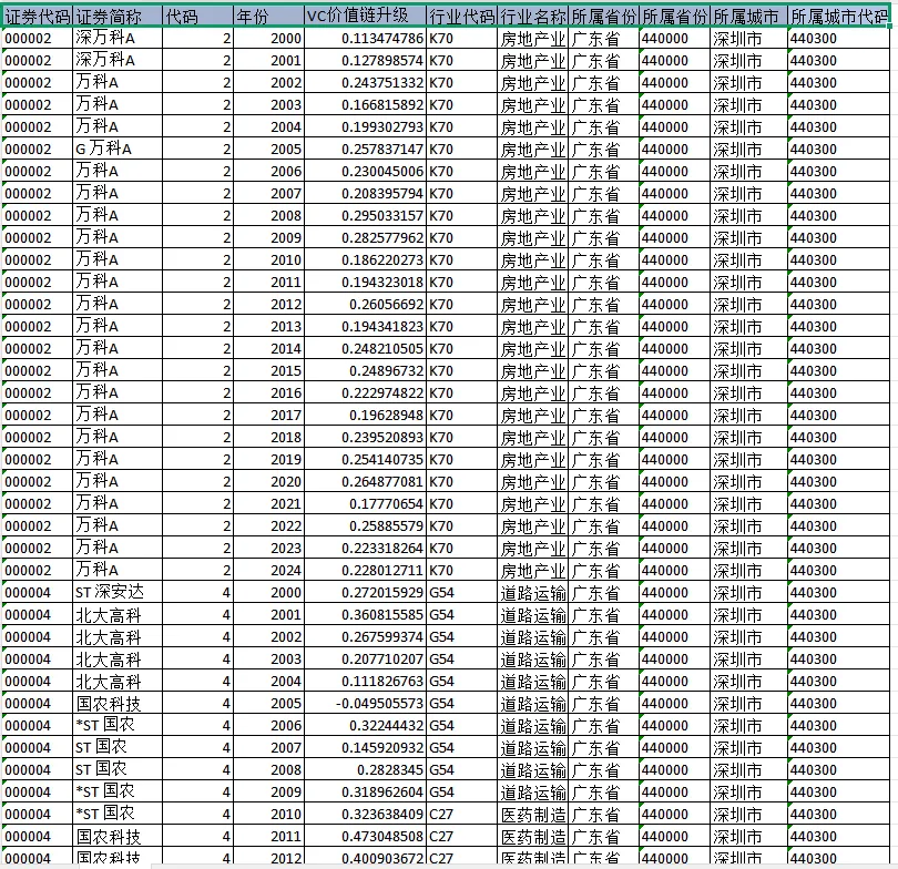 证券代码 证券简称 代码 年份 VC价值链升级 行业代码 行业名称 所属省份 所属省份代码 所属城市 所属城市代码