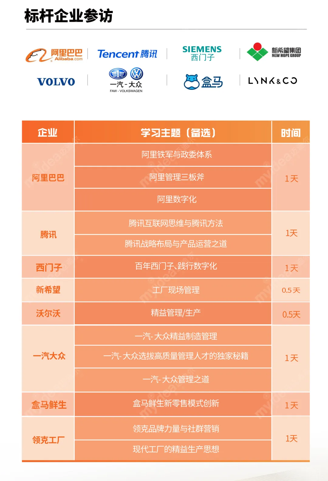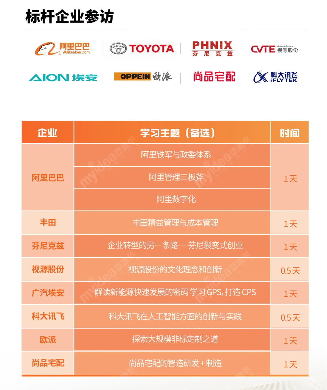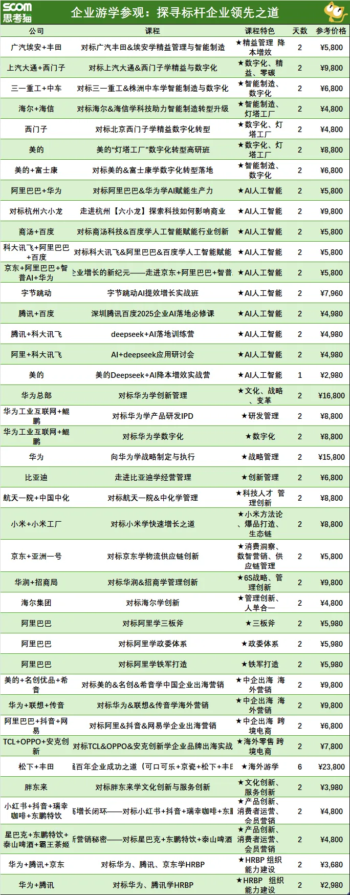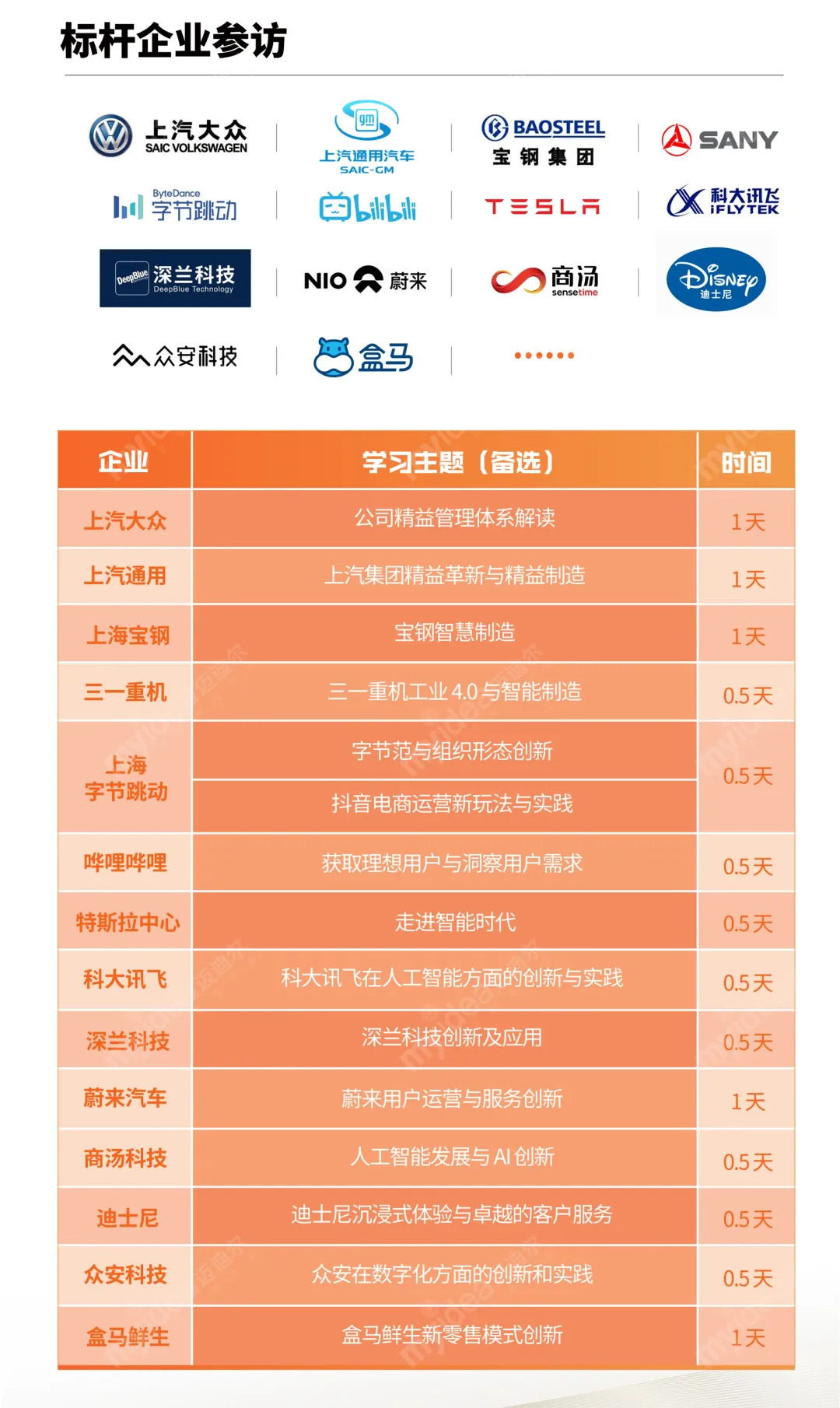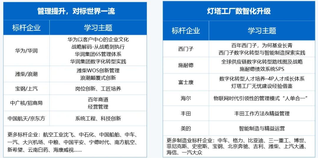 目前灯塔工厂和标杆企业参观课程有西门子、施耐德、联想、富士康、海尔、丰田、美的、中车、格力、比亚迪、三一重工、博世、菲尼克斯、史密斯、宝钢、北京奔驰、SMC、吉利、潍柴、上汽大通、海信、一汽大众、领克汽车、潍柴、中广核、中国航天、沈飞、中石化、中国船舶、云南白药、海康威视、宁德时代、TCL、阿里巴巴、腾讯、字节跳动、深度求索、商汤科技、网易、小红书、星巴克、蒙牛、伊利、胖东来、海底捞等来自科技、制造、互联网各行业、零售业等300多家标杆企业以及在海外的标杆企业如日本丰田、夏普、京等日本名企考察等。