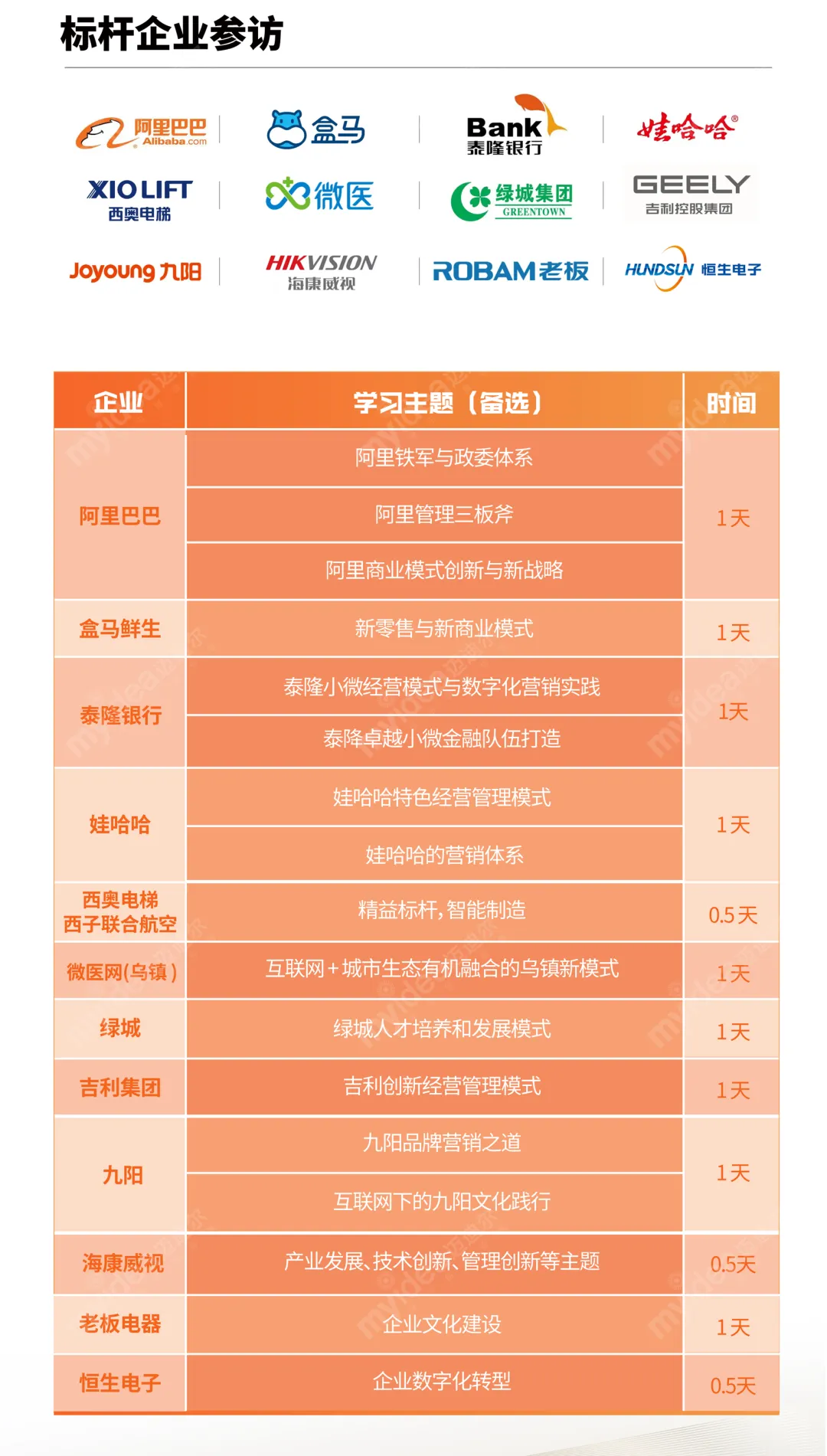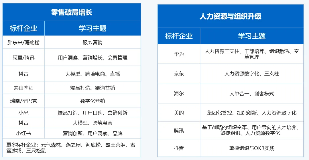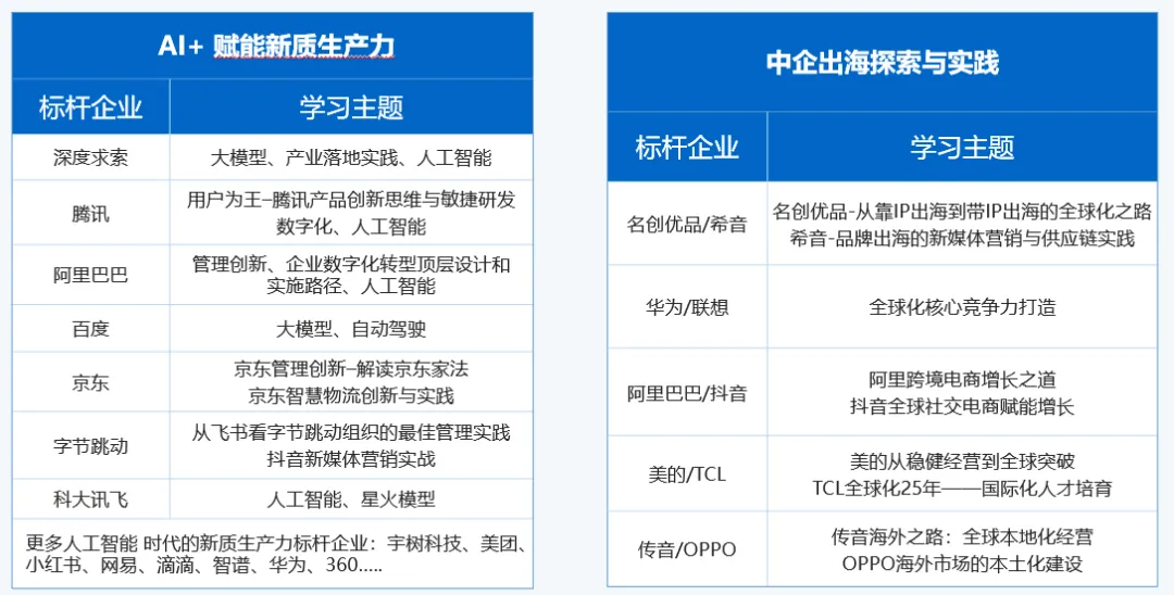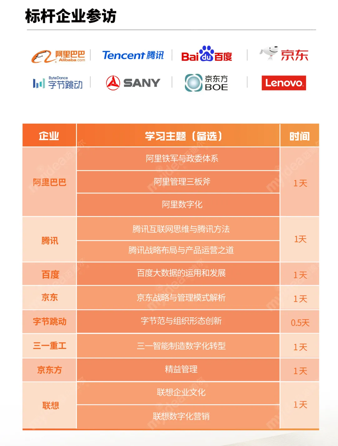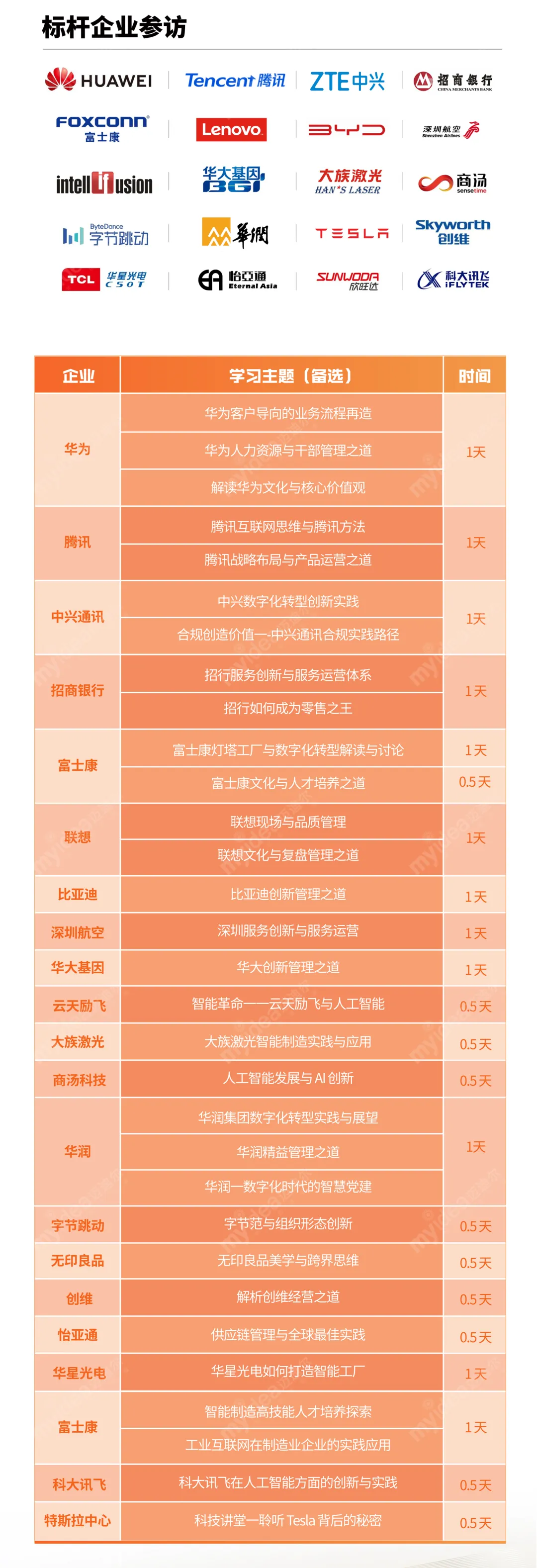 目前灯塔工厂和标杆企业参观课程有西门子、施耐德、联想、富士康、海尔、丰田、美的、中车、格力、比亚迪、三一重工、博世、菲尼克斯、史密斯、宝钢、北京奔驰、SMC、吉利、潍柴、上汽大通、海信、一汽大众、领克汽车、潍柴、中广核、中国航天、沈飞、中石化、中国船舶、云南白药、海康威视、宁德时代、TCL、阿里巴巴、腾讯、字节跳动、深度求索、商汤科技、网易、小红书、星巴克、蒙牛、伊利、胖东来、海底捞等来自科技、制造、互联网各行业、零售业等300多家标杆企业以及在海外的标杆企业如日本丰田、夏普、京等日本名企考察等。