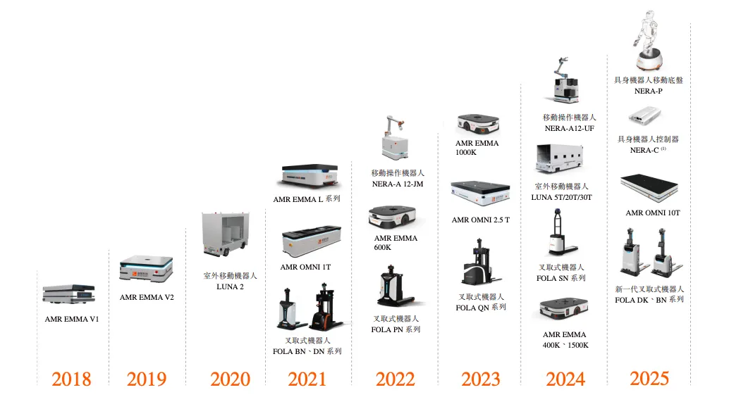 2018年,公司实现首款AMR产品EMMA V1的商业化。此后,公司建立起完整的智能移动机器人产品组合。其EMMA系列已成为高精度内部物流的旗舰平台,定位精度可达±2毫米;OMNI系列则满足重载运输需求,有效载荷高达10吨;FOLA系列自主叉取式机器人实现了全自动仓储及工厂物流;LUNA系列室外移动机器人支持高达60吨的有效载荷;而NERA系列则代表了公司在具身智能领域的最新探索。