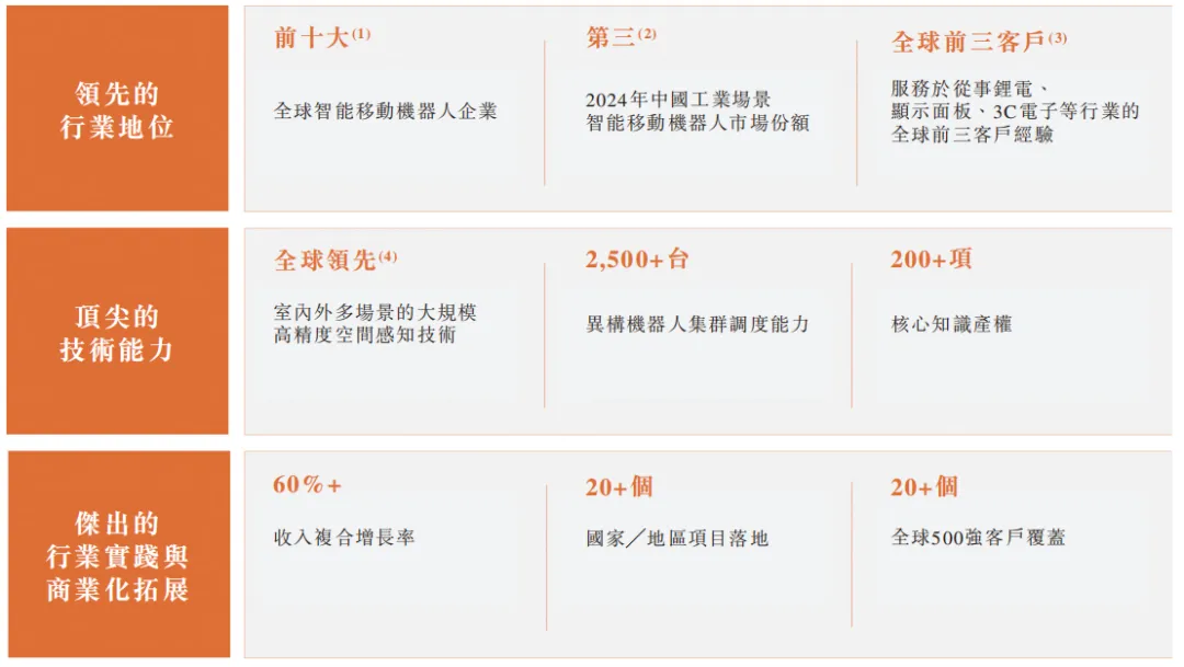 根据灼识咨询的数据,以订单额计算,迦智科技已成为全球前十大智能移动机器人公司,在工业智能移动机器人领域更是跻身全球前列。公司是全球少数具备全栈式自主研发技术的通用机器人解决方案企业之一,所有产品均构建于统一的核心技术平台之上。截至2025年9月30日,公司已在全球部署超过2500台机器人集群,支持室内外多场景的大规模异构机器人协同调度,远超行业平均的落地能力。凭借超强的技术实力和市场表现,公司在竞争激烈的智能移动机器人市场中占据了一席之地,2024年全球前五大厂商合计市场份额约23%,而迦智科技正是其中唯一一家凭借高精度定位技术和最广泛载荷范围实现全场景覆盖的企业。