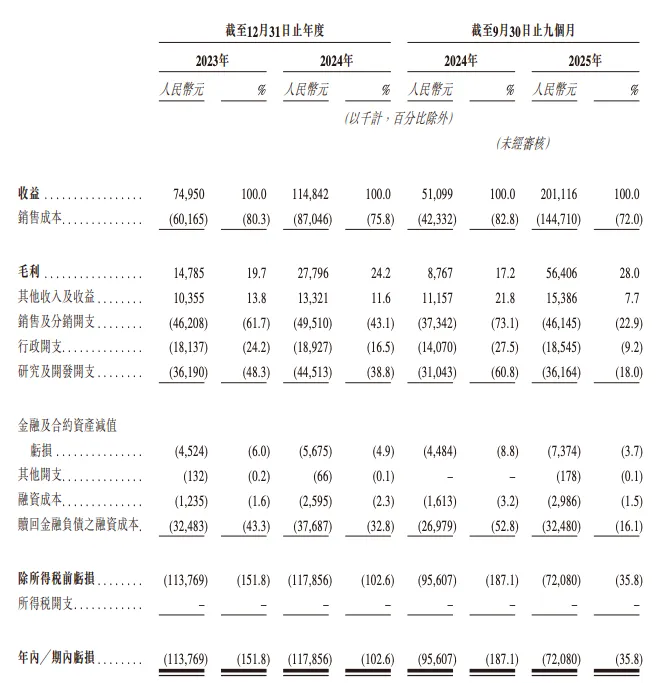 财务数据显示,2023年营业收入为7495万元,2024年增长53.2%至1.148亿元,2025年前三季度更是达到2.011亿元,呈现出爆发式增长态势。同期毛利率从19.7%提升至28%,显示出规模效应和成本控制能力的改善。但公司仍处于战略性亏损阶段,2023年净亏损1.138亿元,2024年亏损1.179亿元,2025年前三季度亏损7210万元。这种亏损主要源于公司为长期成功所做的重大投资,包括持续的高研发投入——2023年和2024年研发费用分别达3620万元和4450万元,占收入比重高达48.3%和38.8%。