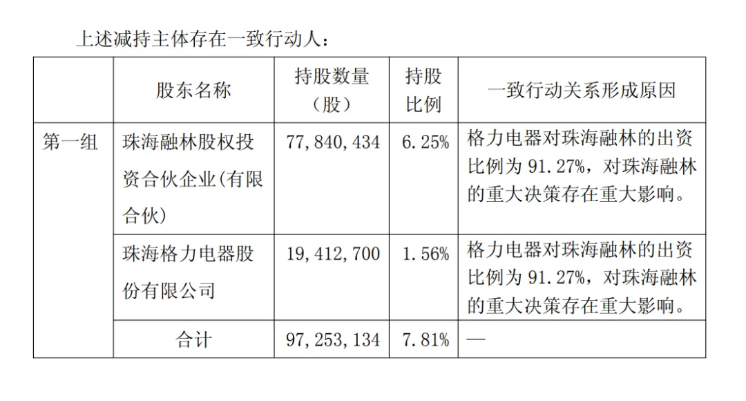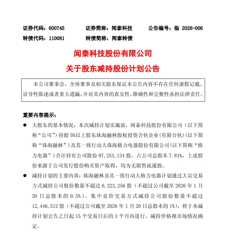 本次减持计划实施前,珠海融林及格力电器合计持有闻泰科技股份约9725万股,占公司总股本7.81%,均为无限售流通股。