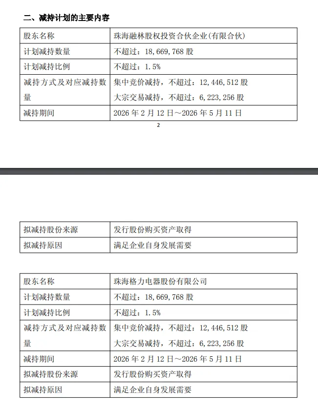 公告显示,公司持股5%以上股东珠海融林股权投资合伙企业(有限合伙)(简称“珠海融林”)及其一致行动人珠海格力电器股份有限公司(简称“格力电器”),计划通过大宗交易方式减持公司股份数量不超过约622万股(不超过公司截至2026年1月20日总股本的0.5%)、集中竞价交易方式减持公司股份数量不超过约1245万股(不超过公司截至2026年1月20日总股本的1%),将于本减持计划公告之日起15个交易日后的3个月内进行,减持价格视市场情况确定。