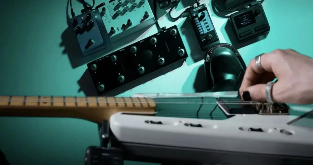 Dimension Shifter能将您的动作流畅地转化为音乐,其奥秘在于利用吉他背带的自然张力。当您移动身体或前倾时,设备会将动作转换为数字指令,并无线传输到踏板接收器。
