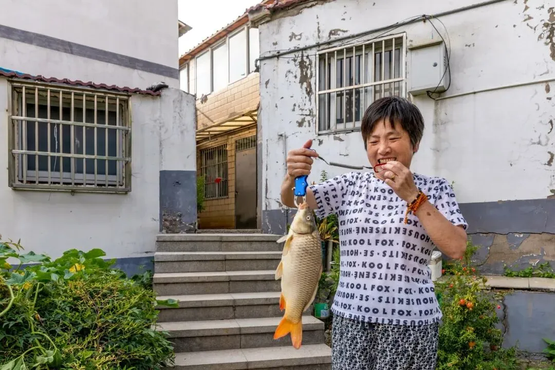 2022年8月,民丰窑村一位妇女手里拿着刚刚从运河上钓到的大鱼在称重。