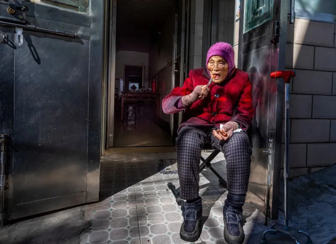 2022年2于22日,民丰窑村96岁的老人在门口晒太阳。