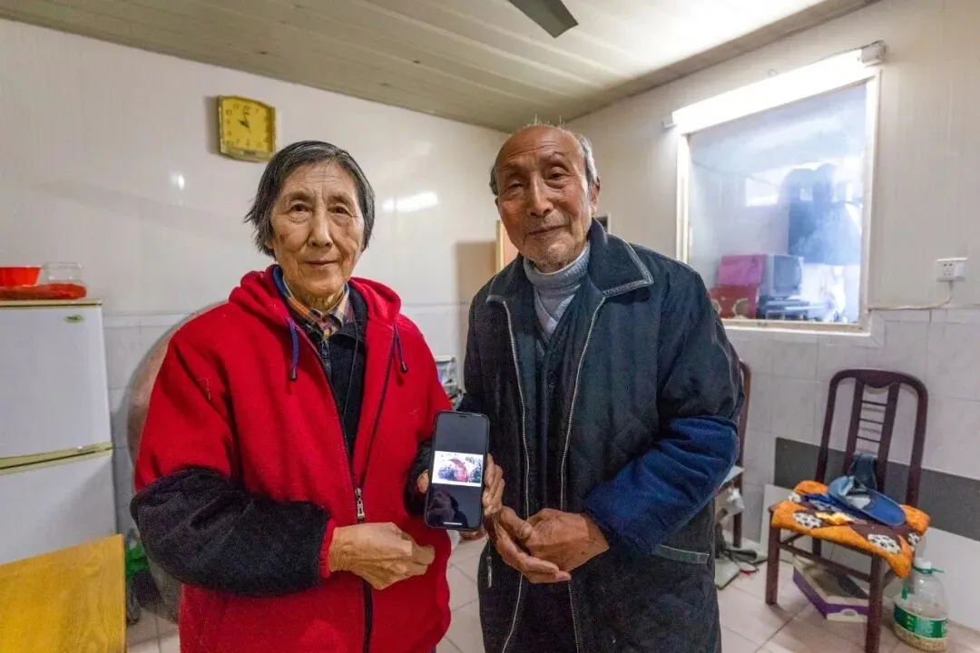 2021年12月7日,横林大桥西村谢国帧夫妻在展示手机里的横林运河老桥。