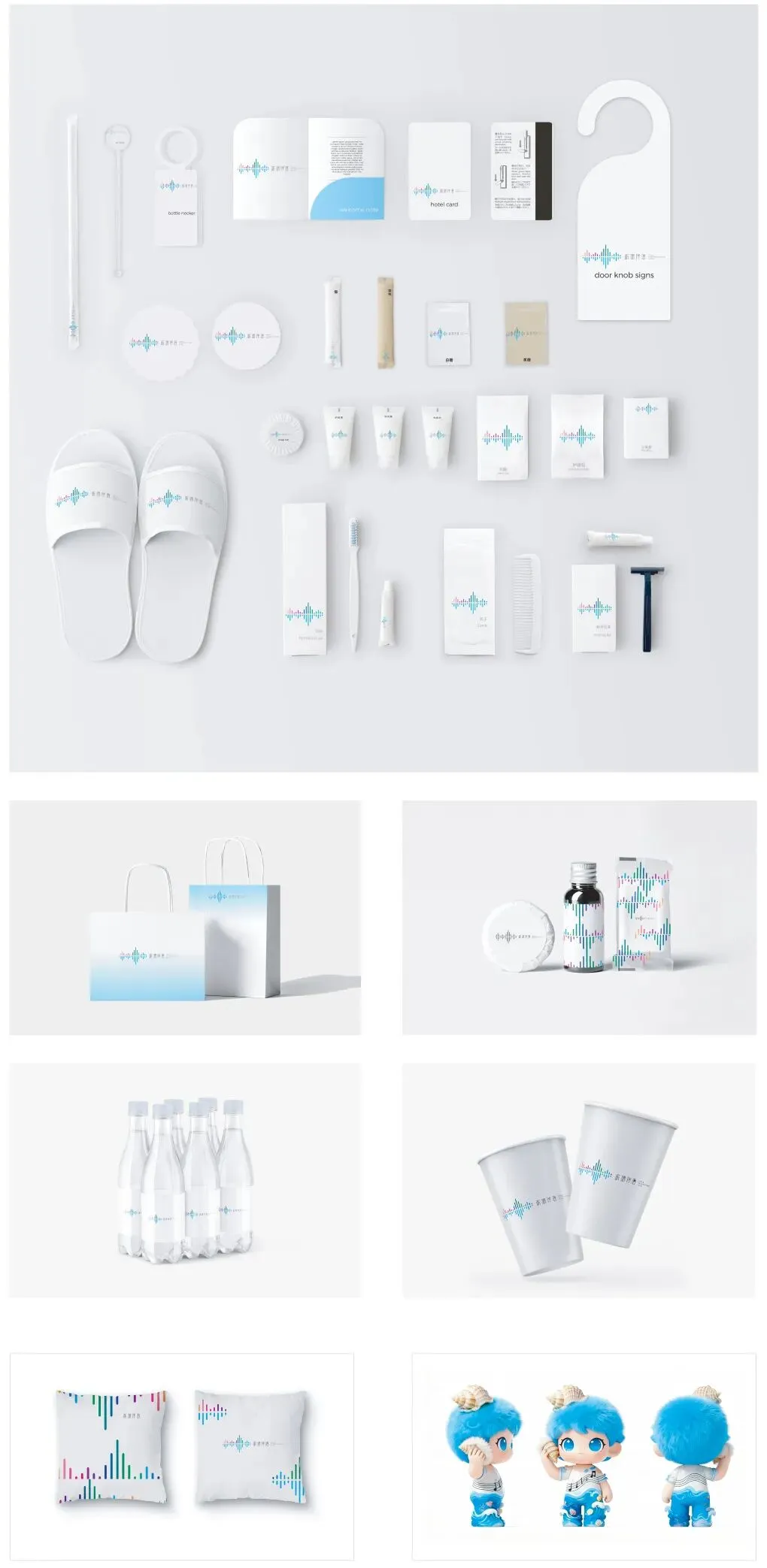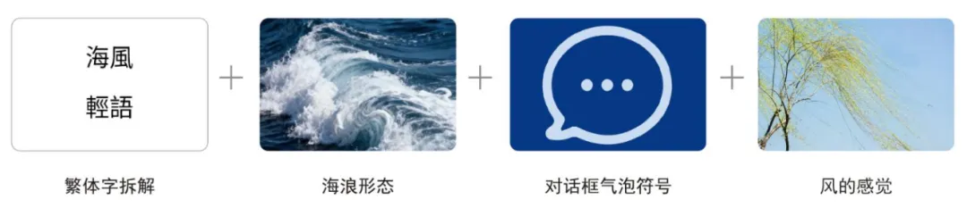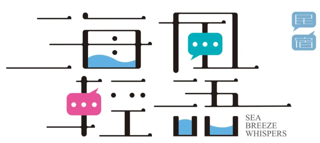 标志以“海风轻语”四字与海浪、海风、对话气泡等元素融合而成。将海风温柔地将文字“吹散”的意象,传递出旅居海边的松弛治愈感。采用后现代解构手法,将“海风轻语”四字拆解为几何线条、碎片模块与对话气泡以错位笔画、松散点线呈现海风流动感,搭配低饱和色调,贴合海滨清新感与年轻客群审美,强化品牌核心记忆点。