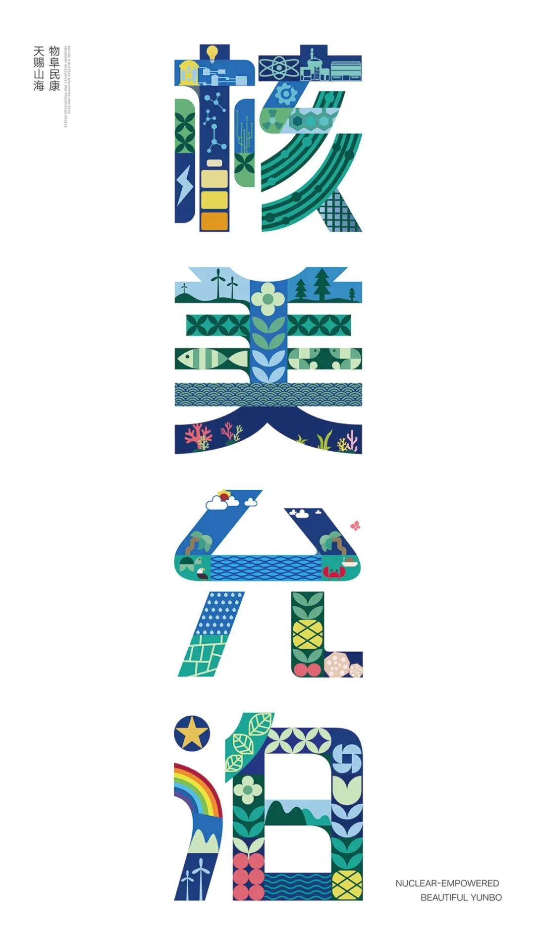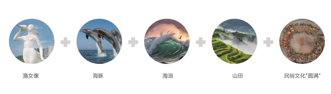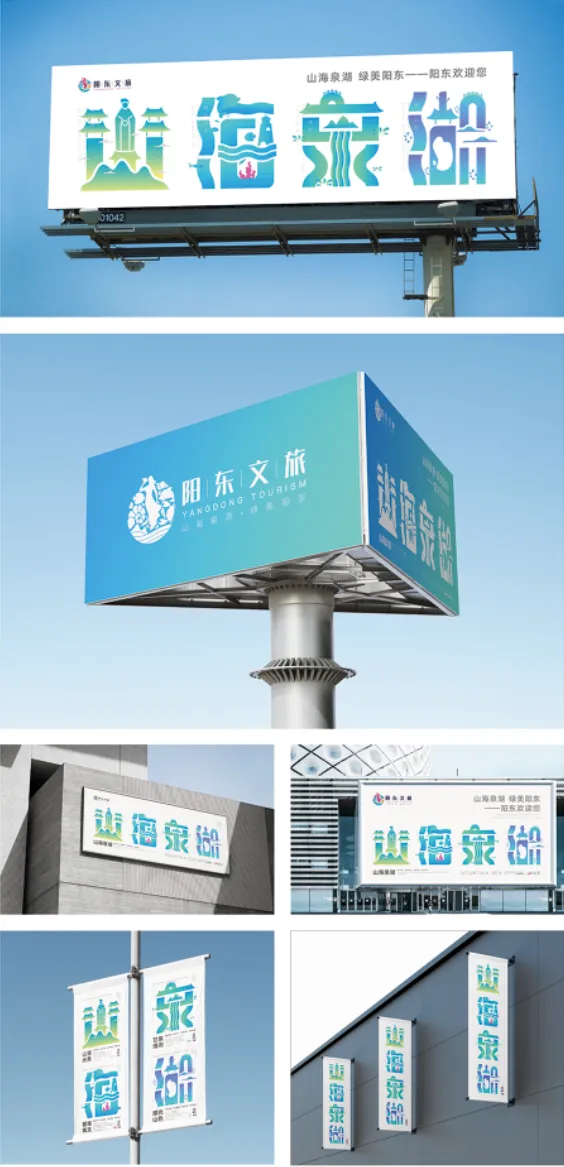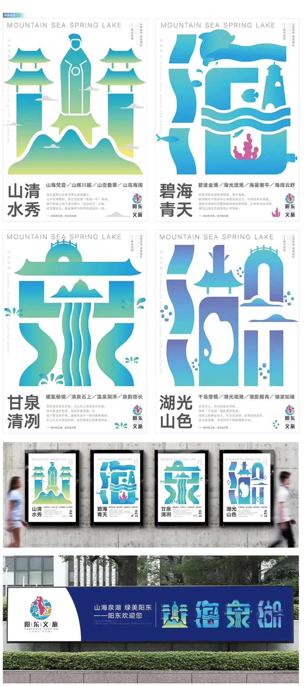 标志提取阳东“唤醒”雕塑中的吹螺渔女形象,融合山、海、泉、湖、白海豚及虾、蟹等海鲜元素组成圆形构图,以传递阳东“山海泉湖,美丽阳东”文旅口号与“耕海牧田”的发展理念。搭配山海蓝、田园绿、丰饶橙、民俗红四色,喻示人与自然的交融共生。主题海报化字为景、一字一景,邀人沉浸于阳东美景与温暖记忆中。