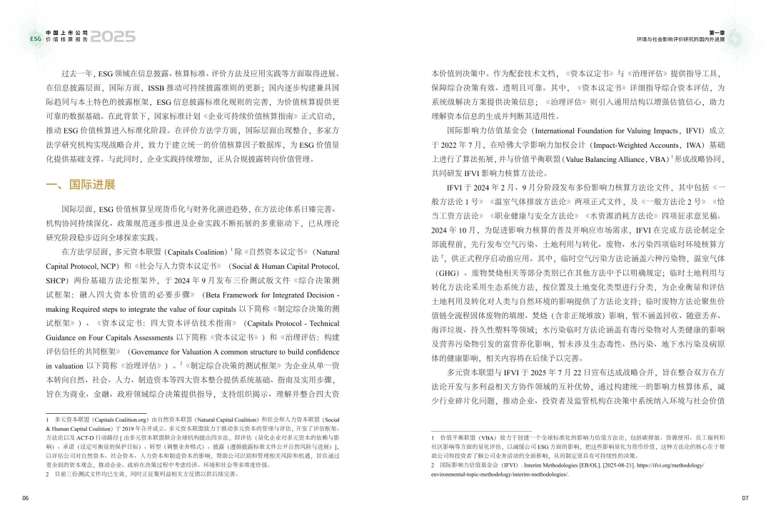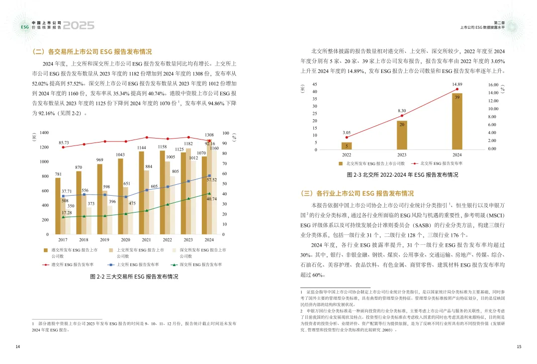 中国上市公司协会与责扬天下(北京)管理顾问有限公司联合发布的《2025年中国上市公司ESG价值核算报告》,系统梳理了近年来国内外在环境与社会影响核算方面的研究成果和实践进展。ESG价值核算通过量化企业在环境和社会方面的外部性影响,为评估公司可持续表现提供了直观的货币化工具。A股及港交所上市的内地公司ESG报告发布数量持续增长,关键指标披露率逐年提升,数据质量明显改善。2024年二氧化碳排放数据质量达到A级的公司数量较2022年增长超过50%。在ESG价值核算方面,实现正面净影响的公司数量持续增加,环境与资源使用强度有所下降,社会价值创造能力不断提升。报告还分析了ESG价值核算在投资领域的应用。通过因子分析验证了多个ESG价值核算指标的有效性,结果显示多数指标具备良好的稳定性和相关性。以ESG风险机遇价值为选股因子构建的投资组合,在回测中表现出正向超额收益,表明ESG价值核算数据在投资策略中具有实际应用价值。在企业运营层面,ESG价值核算可支持双重重要性分析,帮助企业优化信息披露和管理决策。随着《企业可持续价值核算指南》国家标准的推进,ESG价值核算逐步走向标准化,为企业提供系统、科学的指导,助力提升可持续发展能力。国际上,多元资本联盟与国际影响力估值基金会于2024年发布多项整合指引,并计划共建全球统一价值核算数据库。ISSB也对ESG披露标准进行修订,推动行业框架互操作性提升。这些动态反映出全球对ESG价值核算体系的重视与探索。
