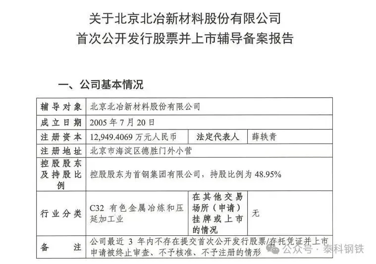 证监会网站披露,北京北冶新材料股份有限公司于2026年1月20日在北京证监局办理辅导备案登记,拟首次公开发行股票并上市,辅导券商为中信证券。辅导备案报告显示,该公司控股股东为首钢集团有限公司,持股比例为48.95%。