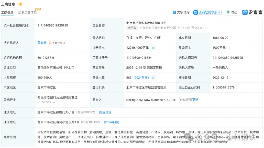 北京北冶新材料股份有限公司曾用名北京北冶功能材料有限公司,是国家级专精特新“小巨人”企业、“北京市隐形冠军企业”、“科改示范企业”、高新技术企业,其前身为1960年成立的北京冶金研究所。北冶公司于2005年由原北京首钢冶金研究院改制而成,位于北京市海淀区清河小营东路1号,占地面积16万平方米,注册资本12949万元,股本结构为:首钢集团有限公司占48.95%,持股平台及其他投资人占51.05%。北冶公司拥有1家全资子公司:北冶功能材料(江苏)有限公司,1家控股子公司:北京首冶磁性材料科技有限公司(持股63.33%)。