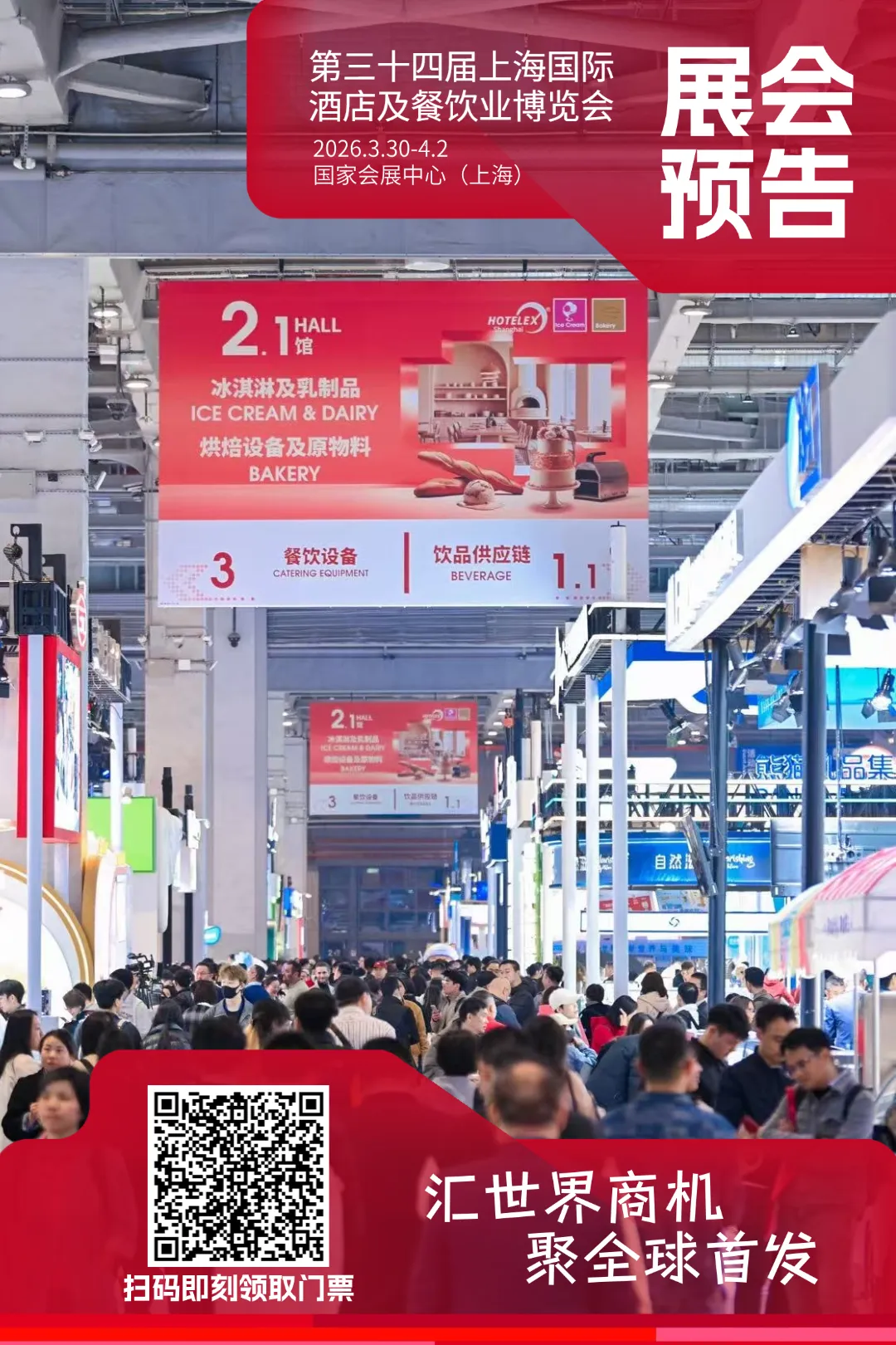 锁定2026酒店餐饮业增长商机,2026年3月30日-4月2日,国家会展中心(上海浦西·虹桥),一年一度的酒店餐饮业盛宴,2026HOTELEX上海展 ,期盼全国乃至全球的行业人一起欢聚上海,共创增长新动能!