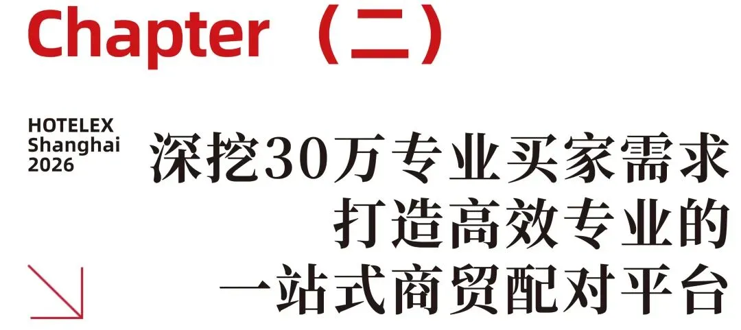 2026HOTELEX上海展在30余载行业沉淀,210万+行业数据库的精准洞察下,深挖专业买家需求,不断优化优秀展商与专业观众之间的高效、便捷的商贸配对促成,不仅是展商展示产品的舞台,更是全球买家的决策入口与资源中枢。