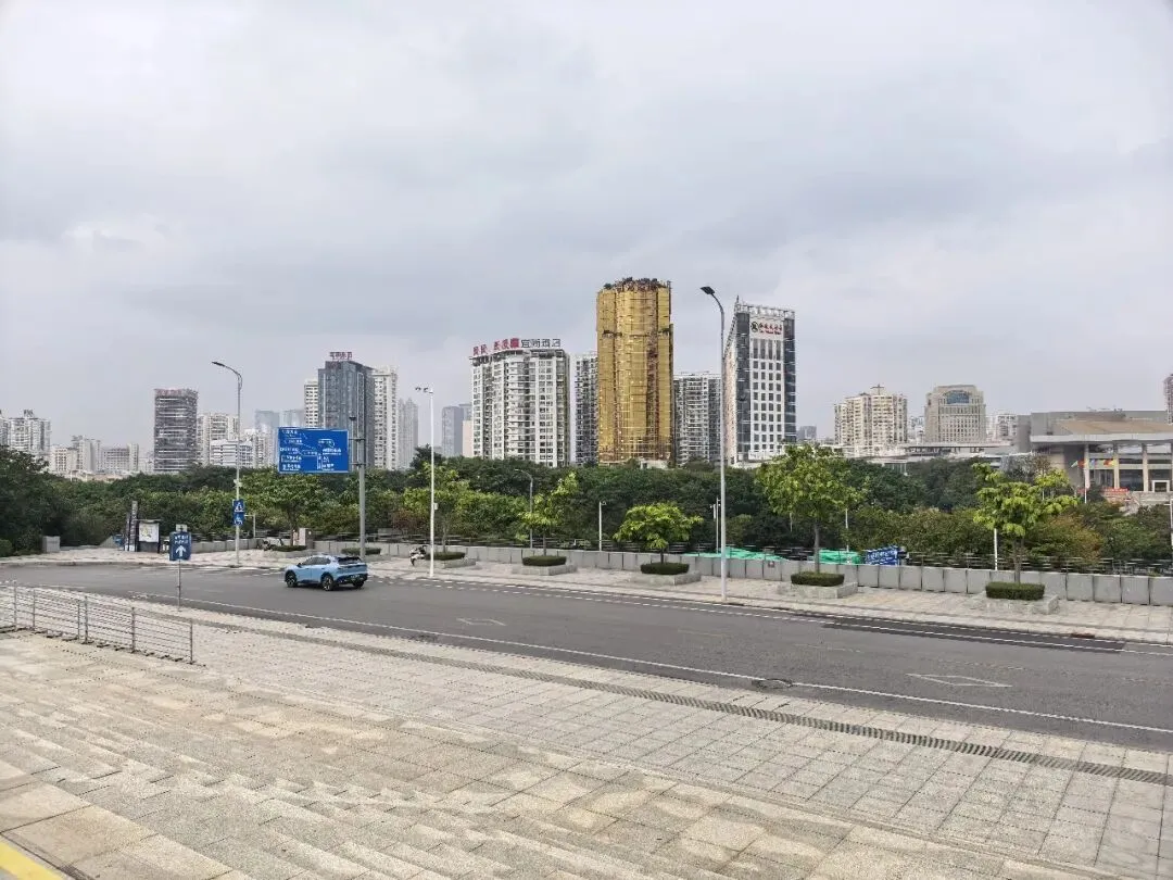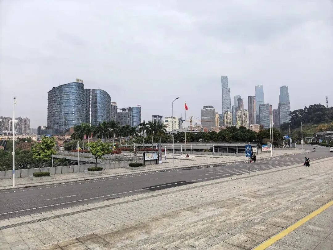 远处的东盟商务区高楼林立,远处灰蓝的天空,和近处葱郁的棕榈树相映成趣。宽阔的马路行人三三两两,少了喧嚣,透着南国特有的从容与舒展。五星红旗威严的矗立在中央,她虽然不说话,却彰显着全国人民大团结奋勇前进的力量。