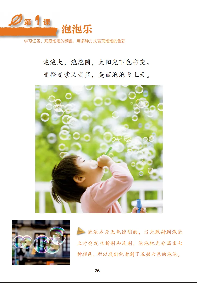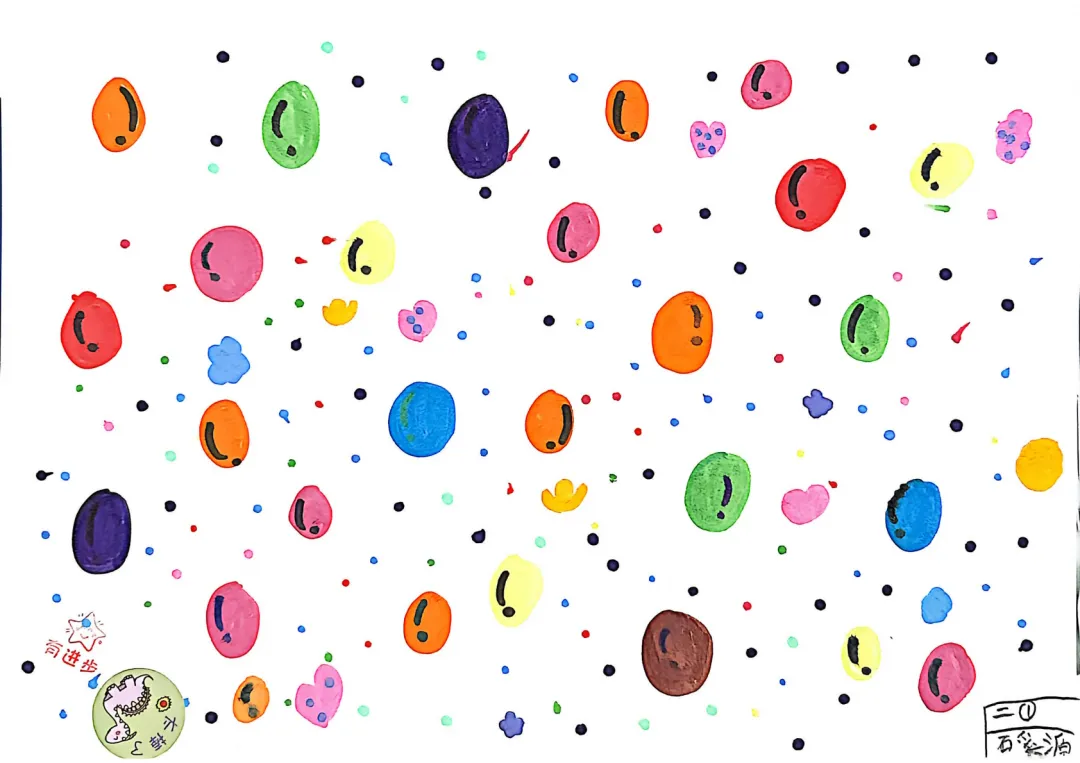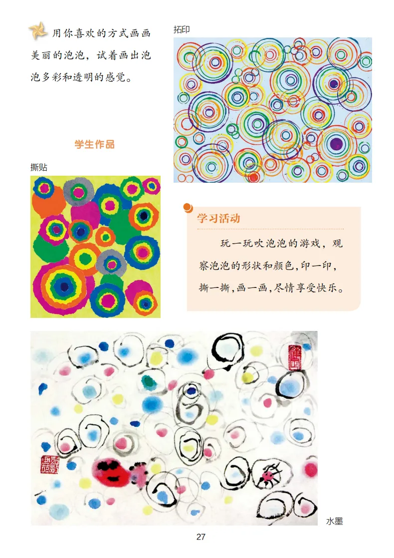 泡泡是生活里最灵动的“色彩精灵”,课堂上我们深耕“观察+实践”双维度:从“泡泡本无色,光照出七彩”的科学原理入手,带学生在吹泡泡游戏中观察阳光折射出的橙、紫、蓝等色彩变化;结合2022版艺术课程标准“造型·表现”核心素养要求,引入拓印、撕贴、水墨等多元技法,鼓励学生大胆用色、自由创作,还原泡泡的“多彩与透明”质感。