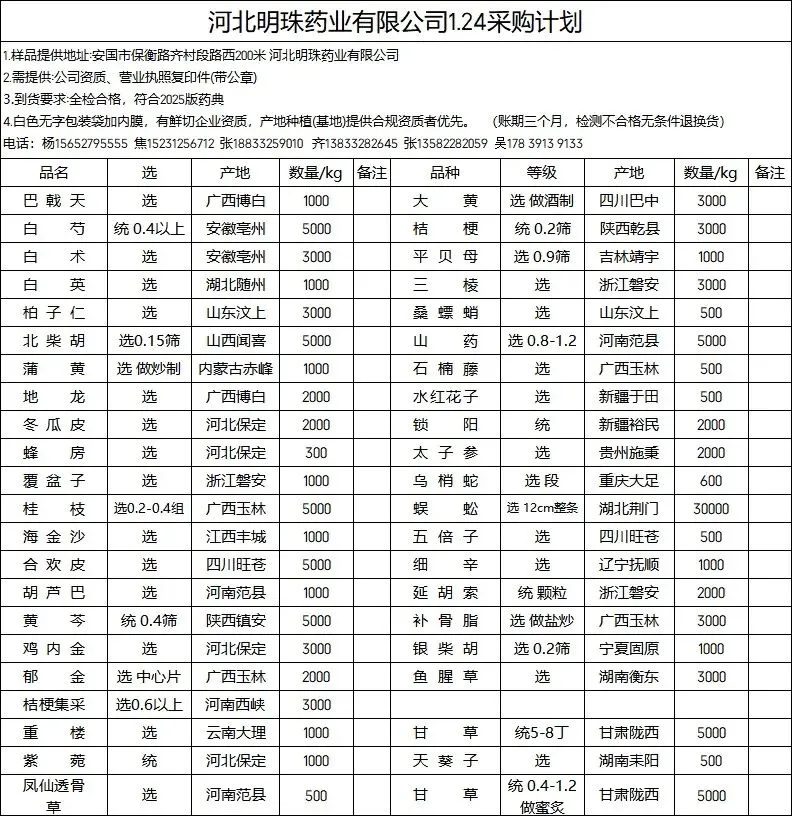 河北明珠药业有限公司招标采购41个品种 免费查看采购联系方式 中药材采购招标计划2026.1.24