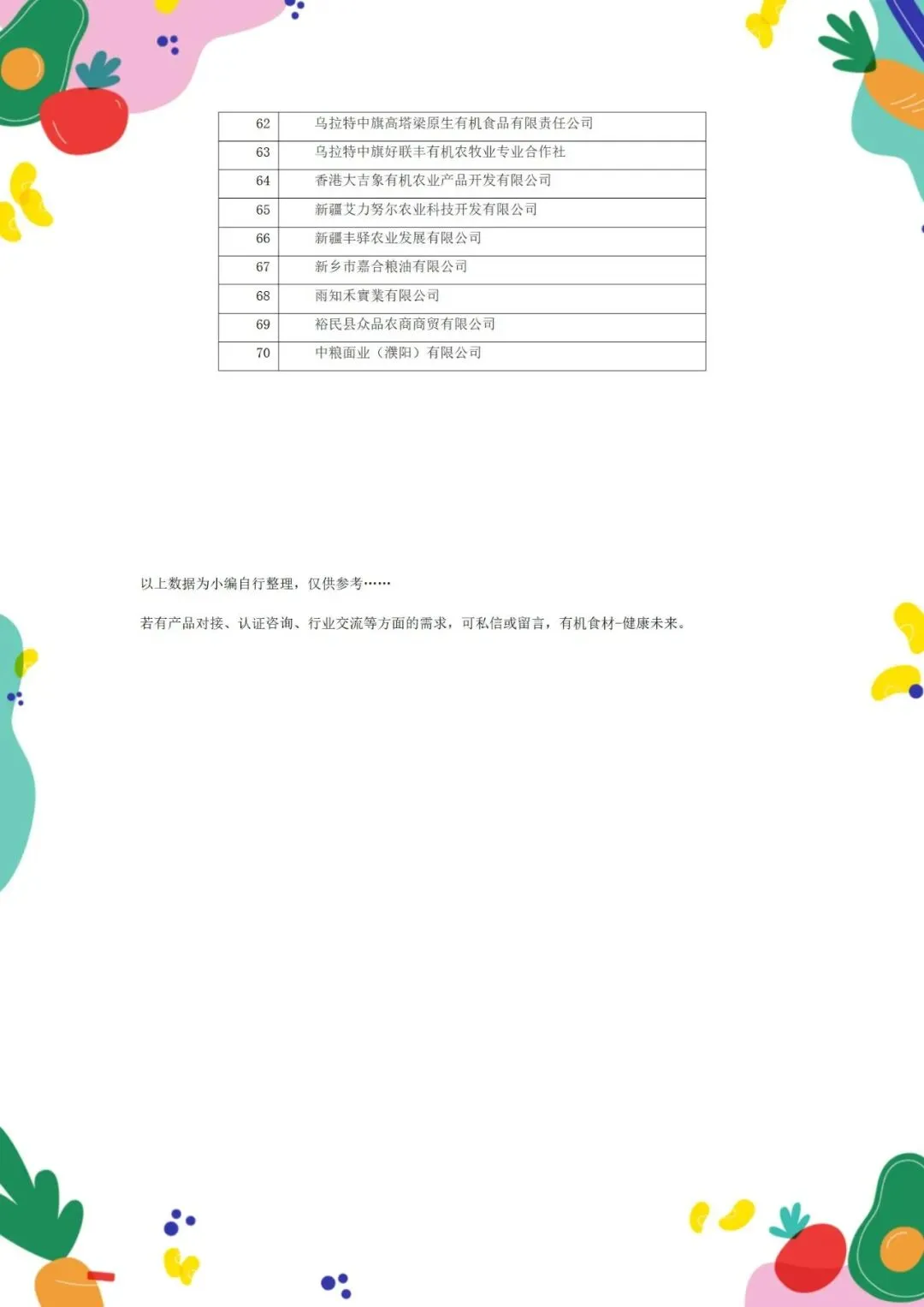 主要指通过有机小麦加工获得的麸质(麦麸),但产业链价值更在于其精深加工产品,如膳食纤维粉、蛋白肽、阿拉伯木聚糖等高附加值成分,麦麸90%用作饲料,而通过超微粉碎、改性、蛋白修饰、活性物质提取等技术,可将其转化为高端食品、保健品原料,应用于食品和饮料、个人护理、药品和保健品、动物饲料等领域。目前,经过中国有机认证的麦麸生产加工企业共有70家,具体如下: