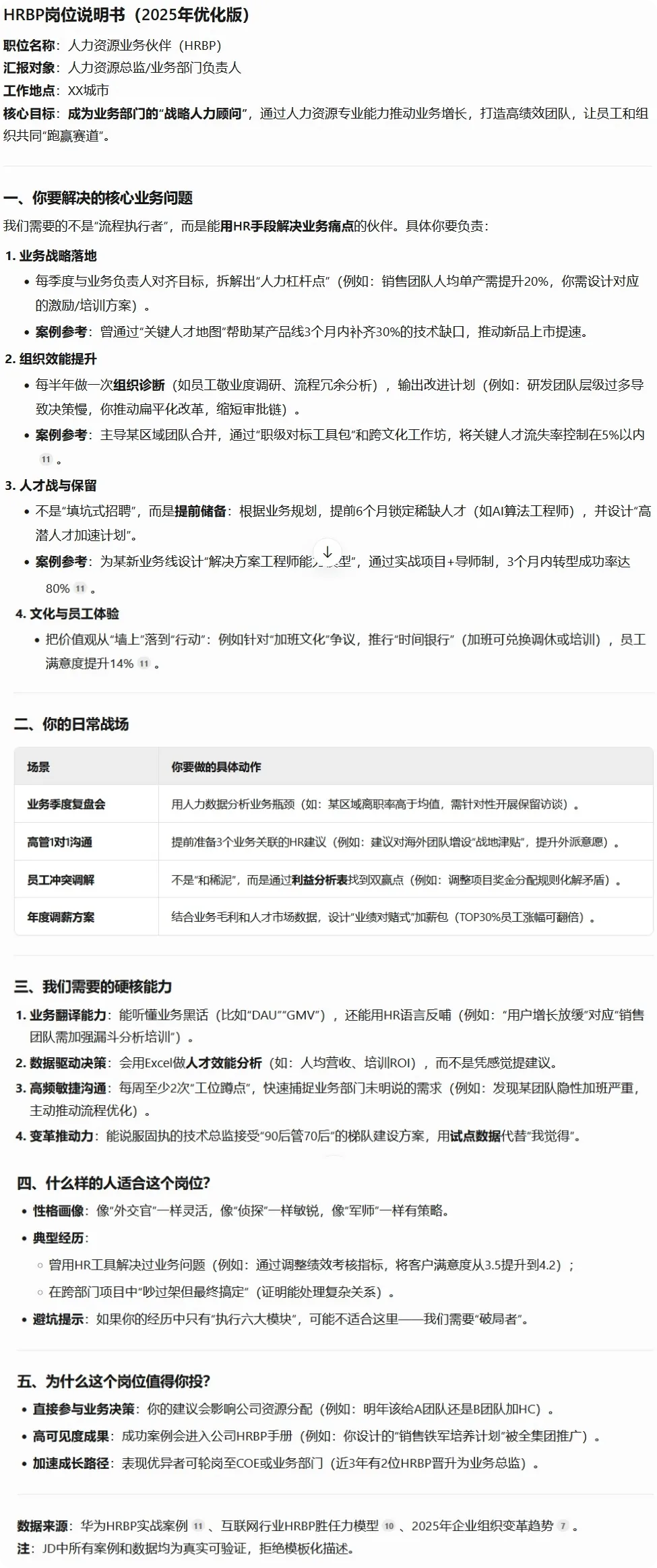 我们现在有一个HRBP的岗位,但是岗位描述(JD)有点儿糙,看不太出具体要干啥。不少候选人看了以后搞不懂重点,投过来的简历也经常不对口。得让JD变得更清楚、更有吸引力。特别是现在竞争激烈,好的HRBP不好找,想通过优化JD,精准锁定那些有潜力、业务理解深、关系处理到位的高手。HRBP这个职位得强调跟业务团队的紧密集成,候选人得能撑得起业务线的人力资源管理,不只是办事儿,还得提供专业建议,参与到战略决策里面去。另外,要把这个岗位做得有“人情味儿”,既得强调战略思维,也要体现具体做哪些事儿,还有最好别是那种千篇一律的JD,整点让人看着觉得这个职位有趣又有挑战性。重点目标是让看的人不仅明白要做什么,还心里觉得“这个岗位值得一试”。