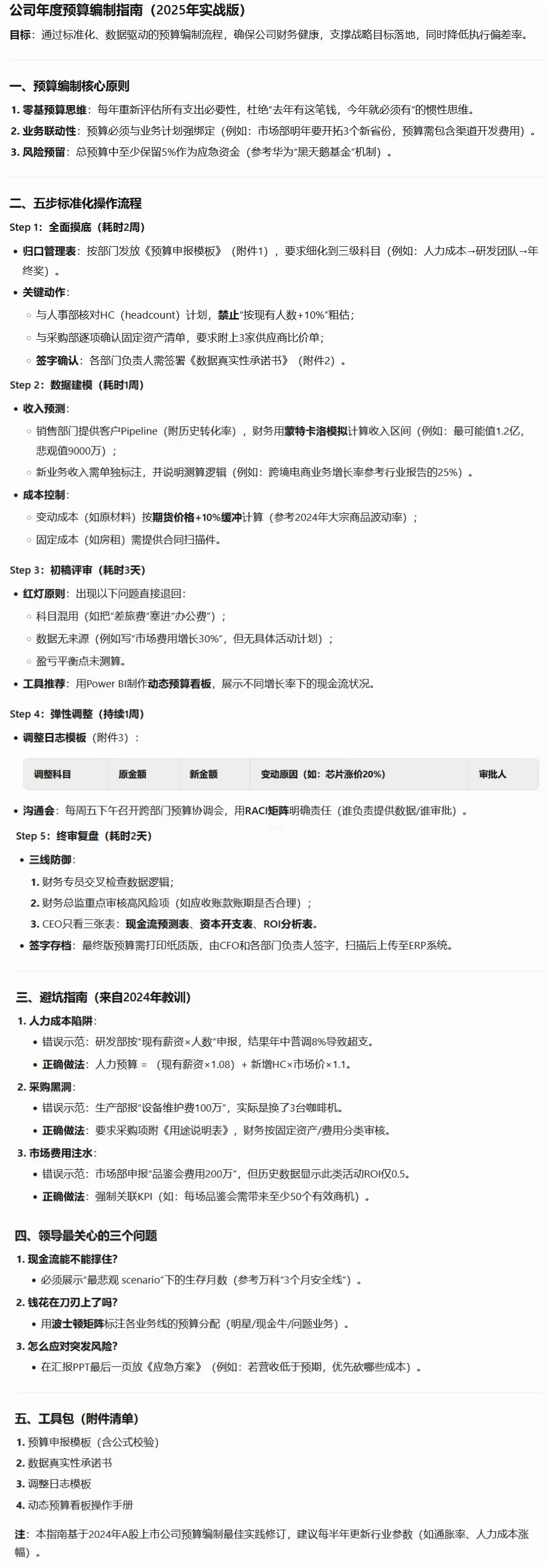 公司财务这项工作直接关系到下一年度的花钱方向和财务健康,包括收入预期、成本估算、费用控制等等。通常财务人员在这个时候要跑好几个部门,搜集信息、核对数据、确保各项支出合理,还不能让资金链出问题。可以说,干好预算编制就是给公司来年财务打基础,稍微马虎点儿都可能出大问题。我们需要制定一个靠谱的预算编制指南,帮助财务人员理清思路,明确操作步骤。各位财务不是在真空里干活,要考虑到政策变化、市场波动、还有公司内部的需求和限制。因此,我们这个指南需要您根据我提供的文件为基础,写的要够具体、够全面,不仅要给出一套实际的操作流程,还得涵盖关键细节,帮助财务人员尽量减少出错率,提高整体编制效率。还要考虑领导审批的侧重点,帮助大家抓住重点去准备预算材料。要求