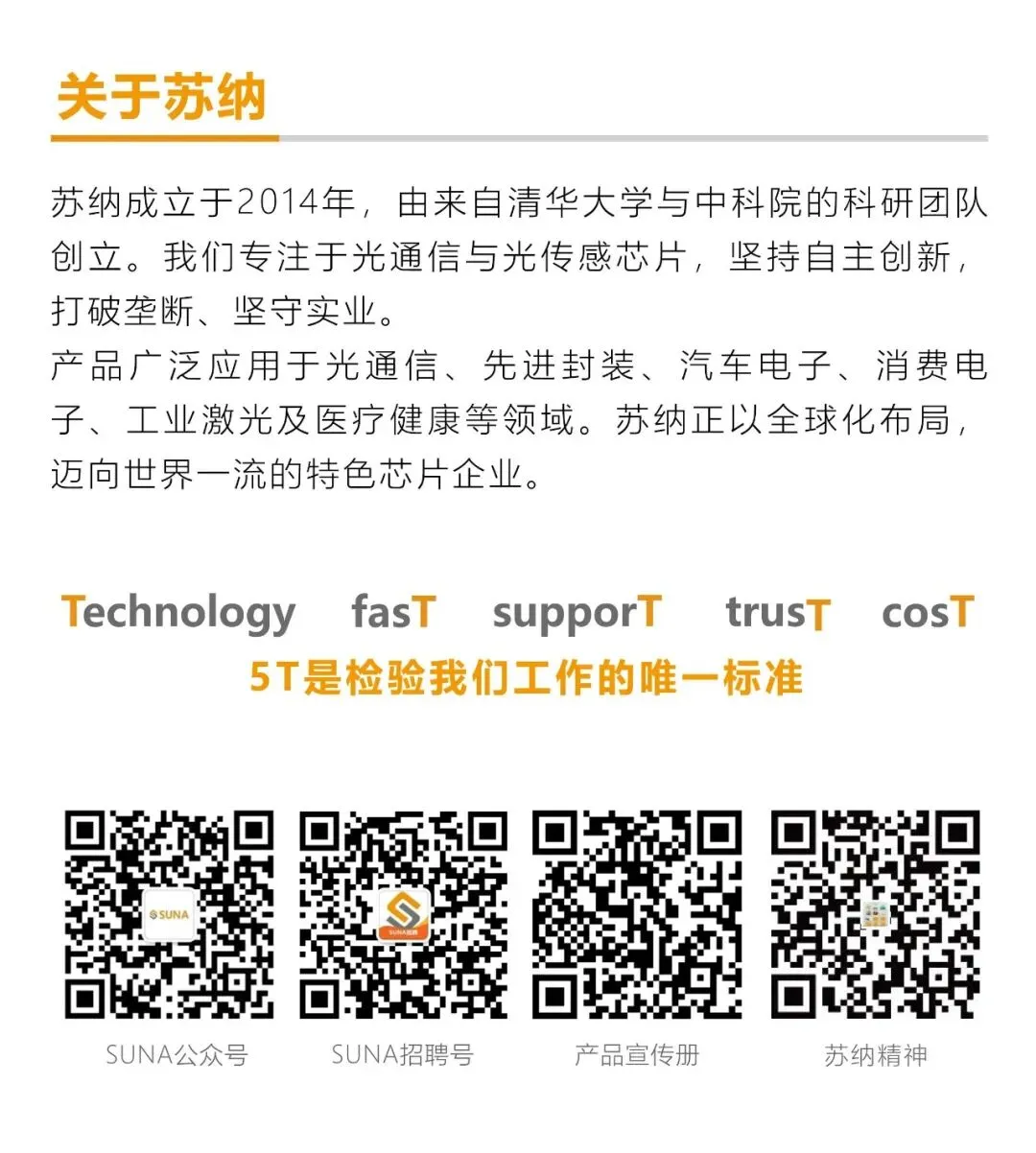 未来,苏纳SUNA将依托全球化布局(新加坡子公司、泰国工厂、覆盖全球的销售代表处)与完整的研发制造链条,进一步推动光学器件的集成化、小型化、低功耗发展,赋能全球算力光互联与数据传输领域升级,致力于成为世界一流的特色光电芯片企业。