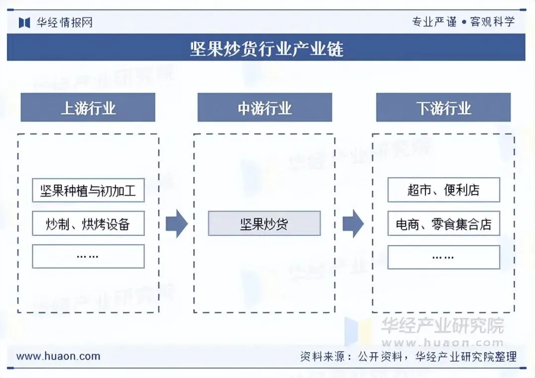 产业链来看,上游为原材料与设备供应环节,涉及坚果种植与初加工,涵盖了去壳、清洗、晾晒等初步处理,加工设备则主要包括炒制设备、烘烤设备、分拣设备、包装设备等;中游为坚果炒货加工环节,涵盖了炒制、烘烤、盐焗、油炸等工艺;下游则是销售环节,包括超市、便利店、电商、零食集合店等渠道。