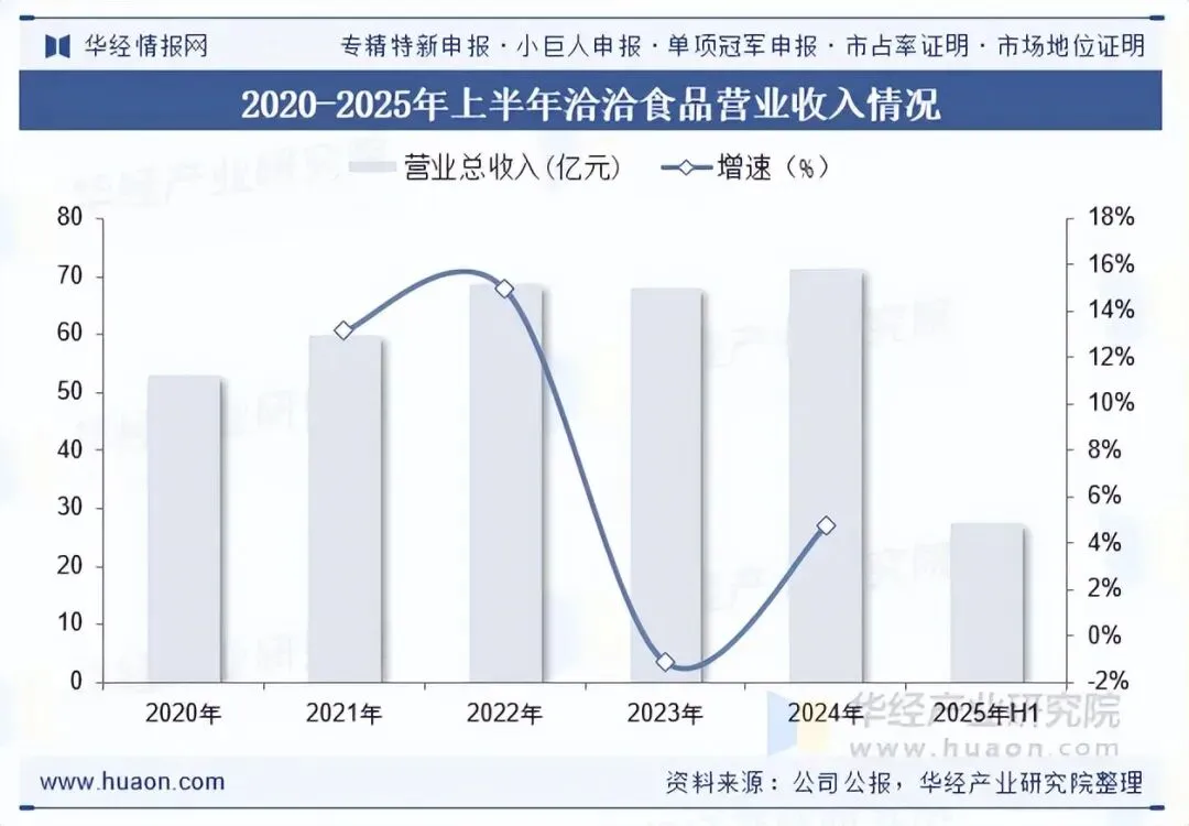 洽洽食品股份有限公司成立于2001年,主要生产坚果炒货类休闲食品。洽洽食品作为中国坚果炒货行业的领军品牌,产品远销国内外近70个国家和地区,拥有较高的知名度和市场影响力;洽洽系列产品有洽洽红袋香瓜子、洽洽蓝袋风味瓜子、洽洽小黄袋每日坚果、洽洽小蓝袋益生菌每日坚果等品牌。2025年上半年,洽洽食品营业总收入为27.52亿元。