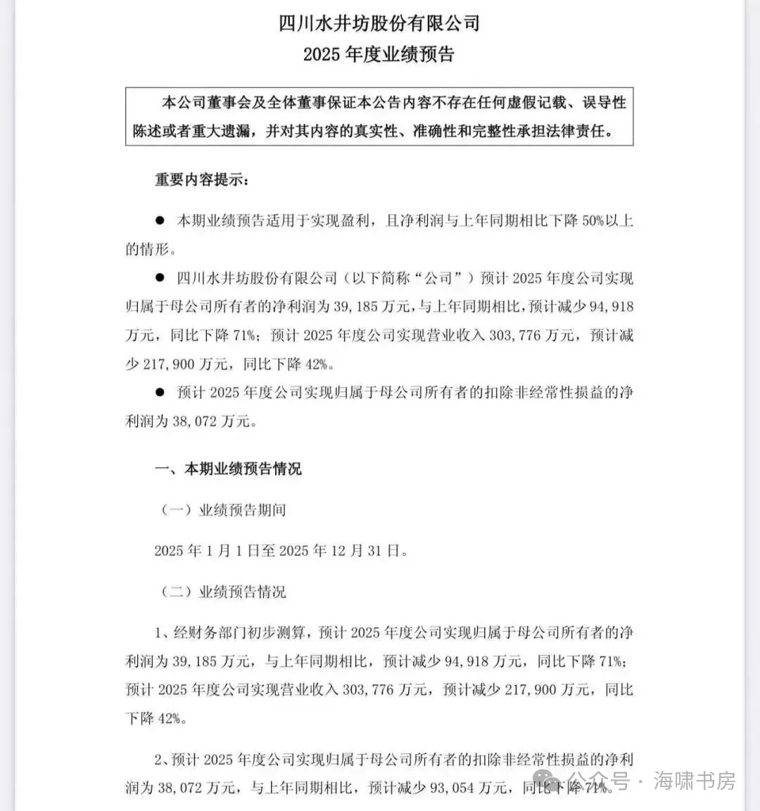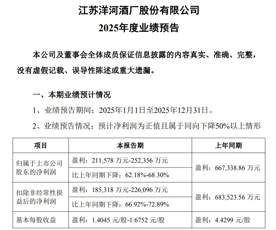 1月23日 洋河股份业绩预告:预计2025年度归母净利润21.16-25.24亿,与上年同期相比,同比下降62.18%-68.30%。扣非净利润18.53-22.61亿,同比下降66.92%-72.89%。业绩下滑公司认为是白酒行业处于深度调整期,行业竞争格局深刻变革,存量竞争加剧背景下,公司受到市场需求减少、品牌势能减弱、渠道库存加大、渠道利润下降等挑战,中端和次高端价位段产品承压较大,部分市场销售受阻,销量明显下降。面对市场严峻的销售形势,2025 年公司营销工作以去库存、稳价盘、提势能为主导,对主要产品进行配额管控,并围绕库存去化和势能提升配置相应的费用投入,对当期盈利能力产生较大影响。1月19日 水井坊业绩预告:预计2025年度营收30.38亿,与上年同期相比,预计减少21.79亿,同比下降42%。归母净利润3.92亿,与上年同期相比,将减少9.49亿,同比下降71%。扣非净利润3.81亿,与上年同期相比,将减少9.31亿,同比下降71%。