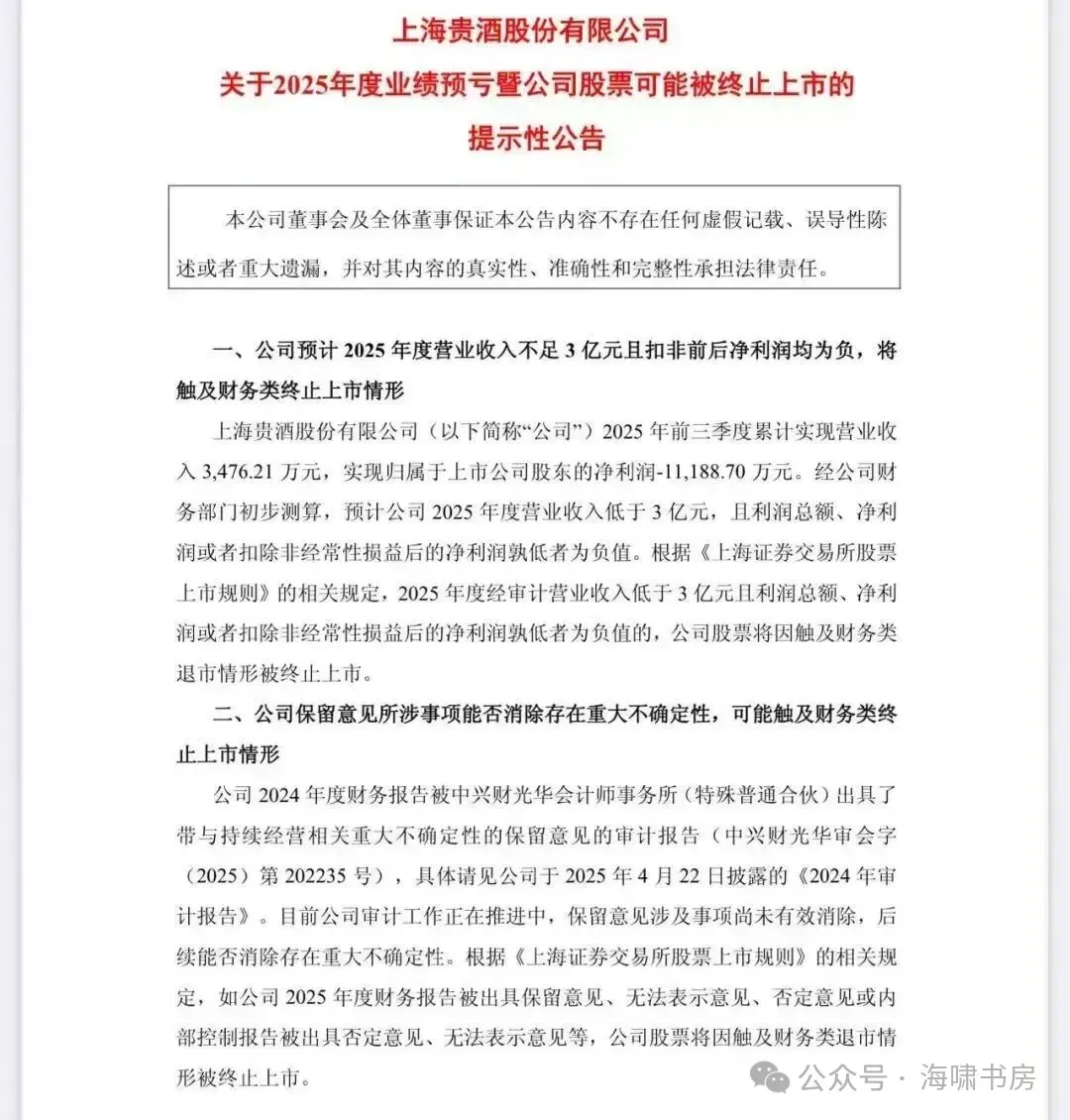 1月12日 *ST岩石(上海贵酒)业绩预告:预计2025年度营收低于3亿,且利润总额、净利润或扣非净利润至少有一项为负值。